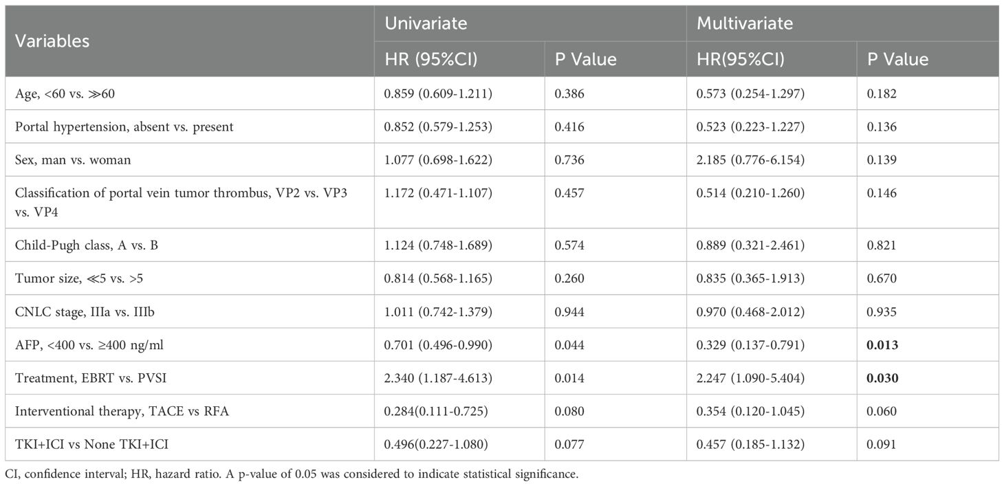 Multivariate analysis identified EBRT treatment (HR=2.247) and AFP < 400 ng/ml (HR = 0.329) as independent prognostic factors. Lower AFP levels correlated with improved response to comprehensive treatment, consistent with its established role as a biomarker for hepatocellular carcinoma aggressiveness. These findings reinforce the utility of AFP in pretreatment risk stratification and corroborate the PVTT prognostic model reported by Peng et al. (31). In addition to the prognostic relevance of alpha-fetoprotein (AFP) that we observed in our research, there is also a growing interest in incorporating serum biomarkers such as AFP and des-gamma-carboxy prothrombin (DCP) into the diagnostic algorithms for screening and monitoring hepatocellular carcinoma (HCC), especially in high-risk populations. For these patients, especially those with markedly elevated AFP and DCP alongside vascular invasion or high risk of early recurrence, more aggressive local therapies like external beam radiotherapy (EBRT) may be warranted over transarterial chemoembolization (TACE) or other interventional approaches. Such cases often respond poorly to conventional interventional treatments, whereas EBRT can achieve broader local control, particularly for tumors in challenging locations or with extensive vascular involvement (32).