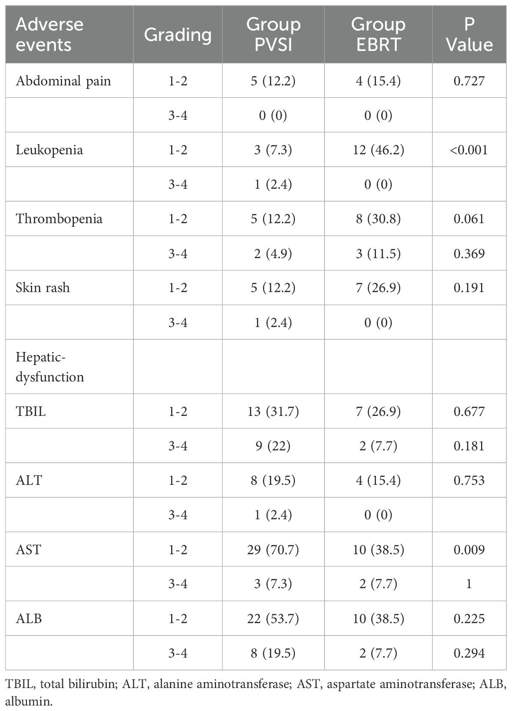 The EBRT group exhibited significantly higher hematological toxicity, with grade 1–2 leukopenia occurring in 46.2% of patients versus 7.3% in the PVSI group (P < 0.001), reflecting bone marrow suppression and underscoring the importance of enhanced hematopoietic monitoring. Liver function abnormalities were more pronounced in the PVSI group, where AST levels rose in 70.7% of cases compared to 38.5% (P = 0.009), likely due to localized particle radiation and mechanical injury to hepatic sinusoidal endothelial cells during stent placement. These findings corroborate the mechanisms reported by Tan et al. (28, 30). Among the grade 3 adverse events, the most common were thrombocytopenia, elevated bilirubin, elevated AST, and elevated ALB. The incidence of each event, however, remained below 20%. Both groups showed relatively low rates of severe adverse events (》grade 3). There was no statistically significant difference, suggesting that the toxicity profiles of both treatments align with their known effects and are safe and manageable within the study cohort.