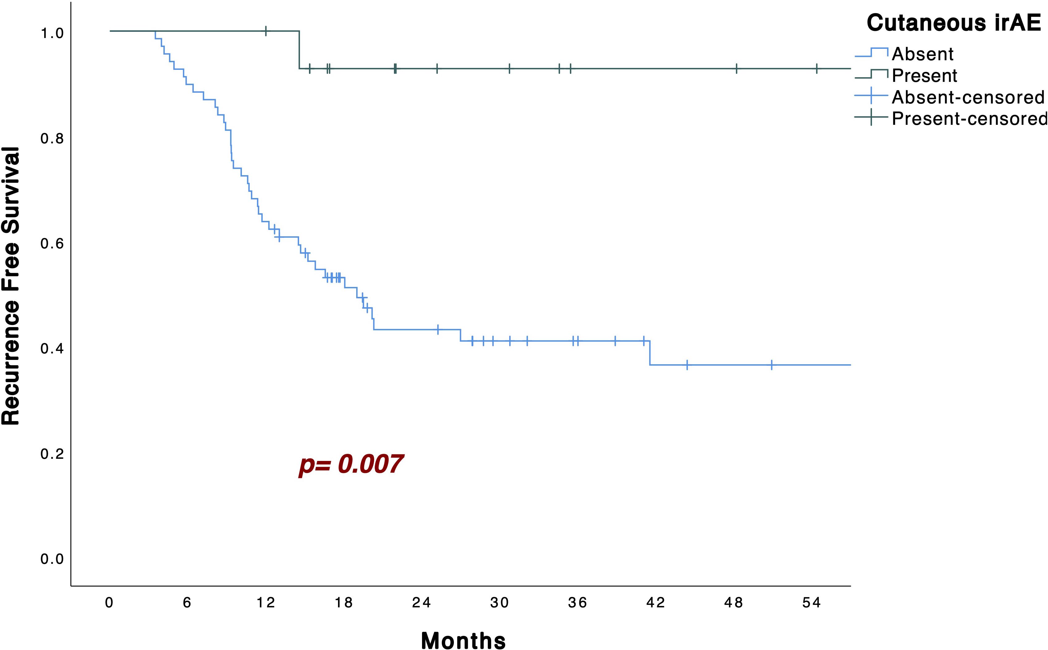 Figure 1. Kaplan–Meier curves for recurrence-free survival in patients with or without cutaneous irAEs.