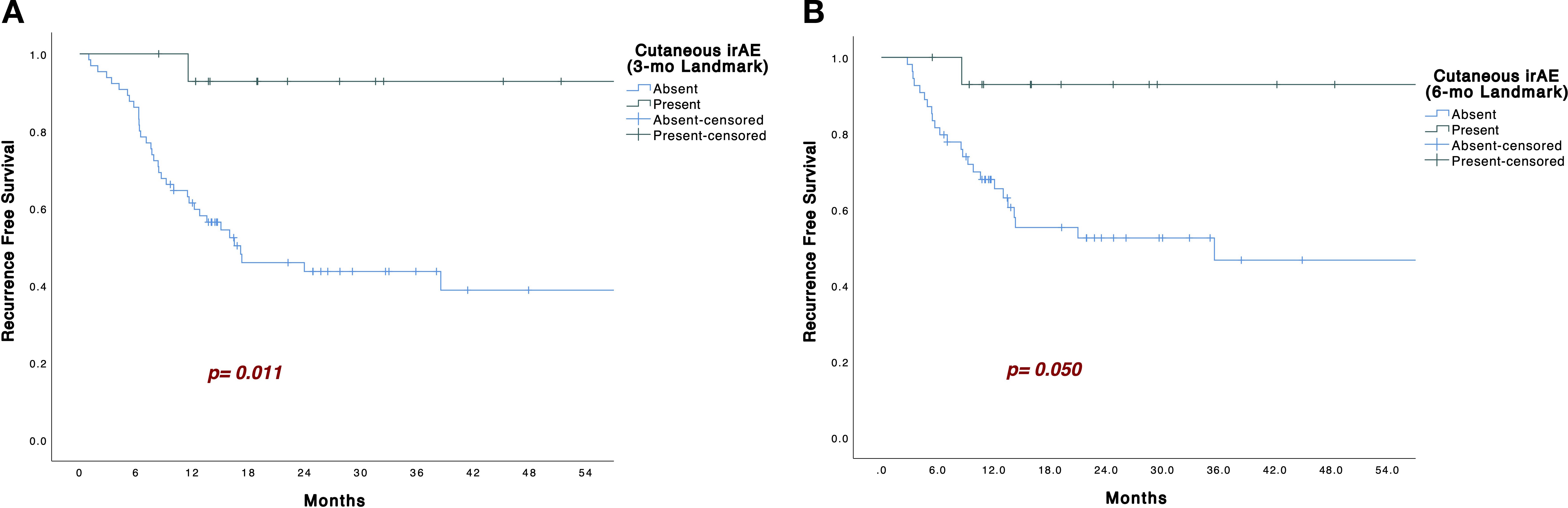 Figure 2. (A). Kaplan–Meier curves with 3 months landmark analysis for recurrence-free survival in patients with or without cutaneous irAEs. (B). Kaplan–Meier curves with 6 months landmark analysis for recurrence-free survival in patients with or without cutaneous irAEs.