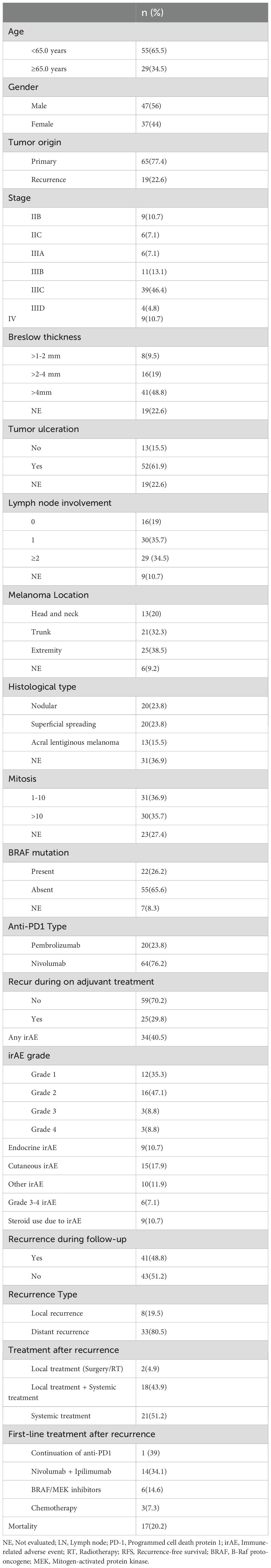 Regarding the type of anti–PD-1 agent received, 64 patients (76.2%) were treated with nivolumab, and 20 patients (23.8%) received pembrolizumab. Baseline characteristics are summarized in Table 1.