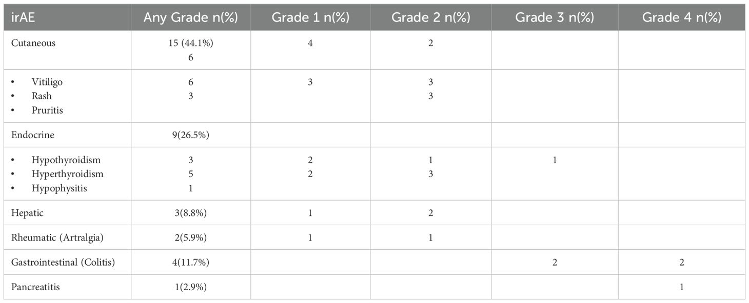Other irAE subtypes were less common, including hepatic (n=3), rheumatic (n=2), gastrointestinal (n=4), and pancreatic irAEs (n=1). Notably, two patients developed Grade 3–4 colitis, and one experienced Grade 4 pancreatitis. 9 patients (10.7%) required systemic corticosteroids for irAE management, most commonly in the setting of gastrointestinal or hepatic toxicity. A full breakdown of irAEs by type and severity grade is presented in Table 2.
