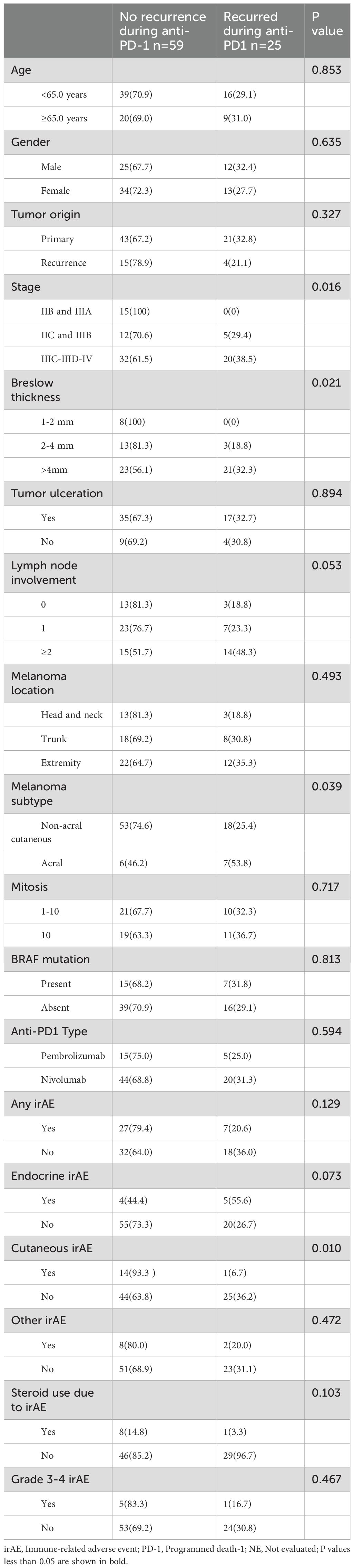 Among the 84 patients who received adjuvant anti–PD-1 therapy, 25 (29.8%) experienced disease recurrence during treatment, while 59 (70.2%) completed the planned therapy without recurrence. Clinicopathological characteristics were compared between these two groups to identify factors associated with recurrence during active treatment.