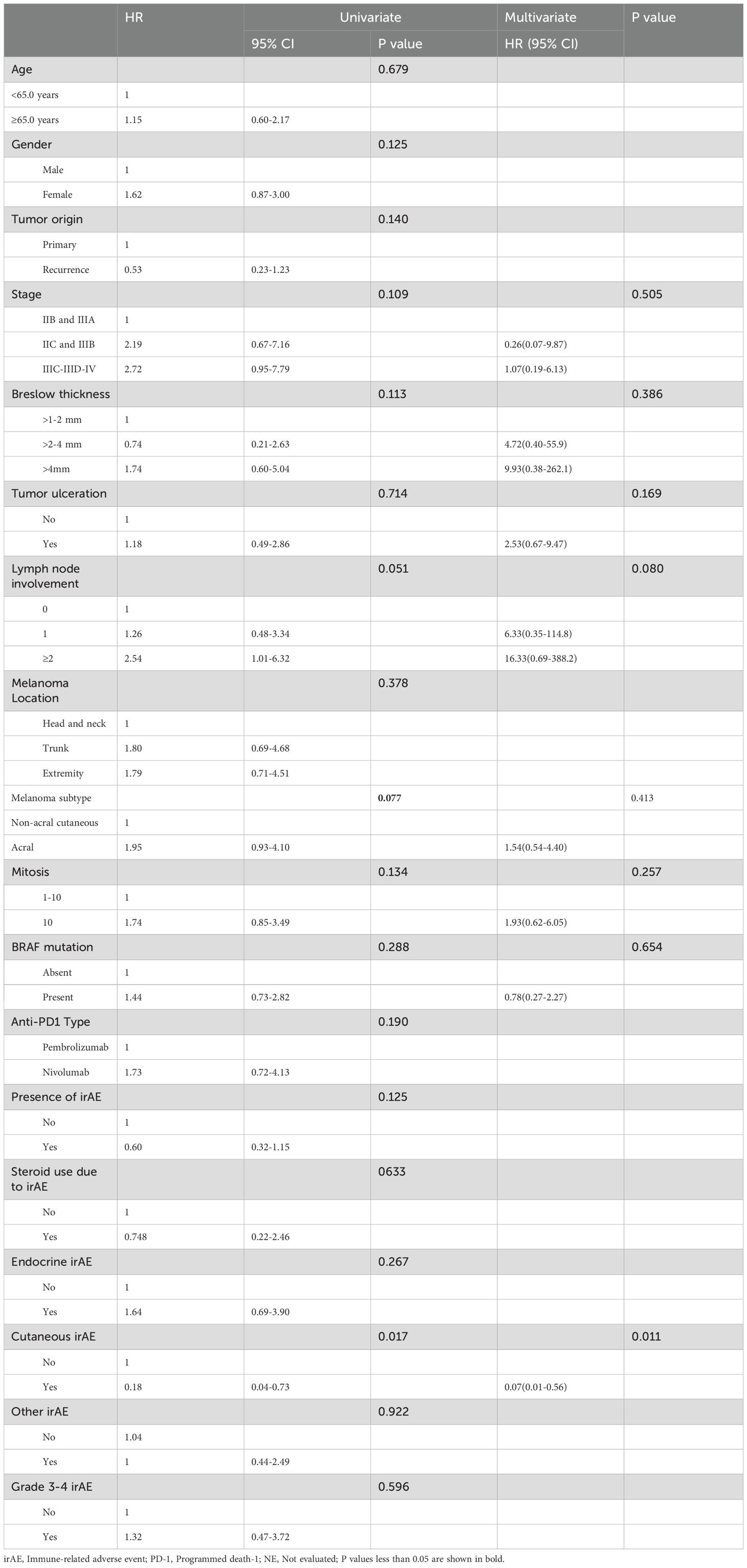 The median RFS for the entire cohort was 26.9 months, and the 1-year RFS rate was 70.2%. In univariate Cox regression analysis, the occurrence of cutaneous irAEs within the first 6 months of treatment was significantly associated with improved RFS (HR: 0.18, 95% CI: 0.04–0.73, p=0.017). Additionally, patients with acral melanoma subtype (HR: 1.95, 95% CI: 0.93–4.10, p=0.077) and those with ≥2 involved lymph nodes (HR: 2.54, 95% CI: 1.01–6.32, p=0.051) showed a trend toward shorter RFS.