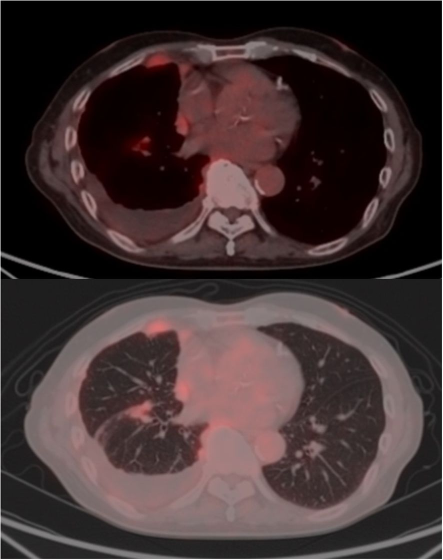 Figure 1. Radiological findings of malignant pleural mesothelioma. Positron emission tomography (PET) revealed asymmetric thickening of the right pleura, including the interlobar pleura, with heterogeneous fluorodeoxyglucose (FDG) uptake (peak SUVmax 4.0). Abnormal FDG accumulation was also observed in an enlarged lymph node-like structure located anterior to the right brachiocephalic vein and contiguous with the thickened pleura. Additionally.