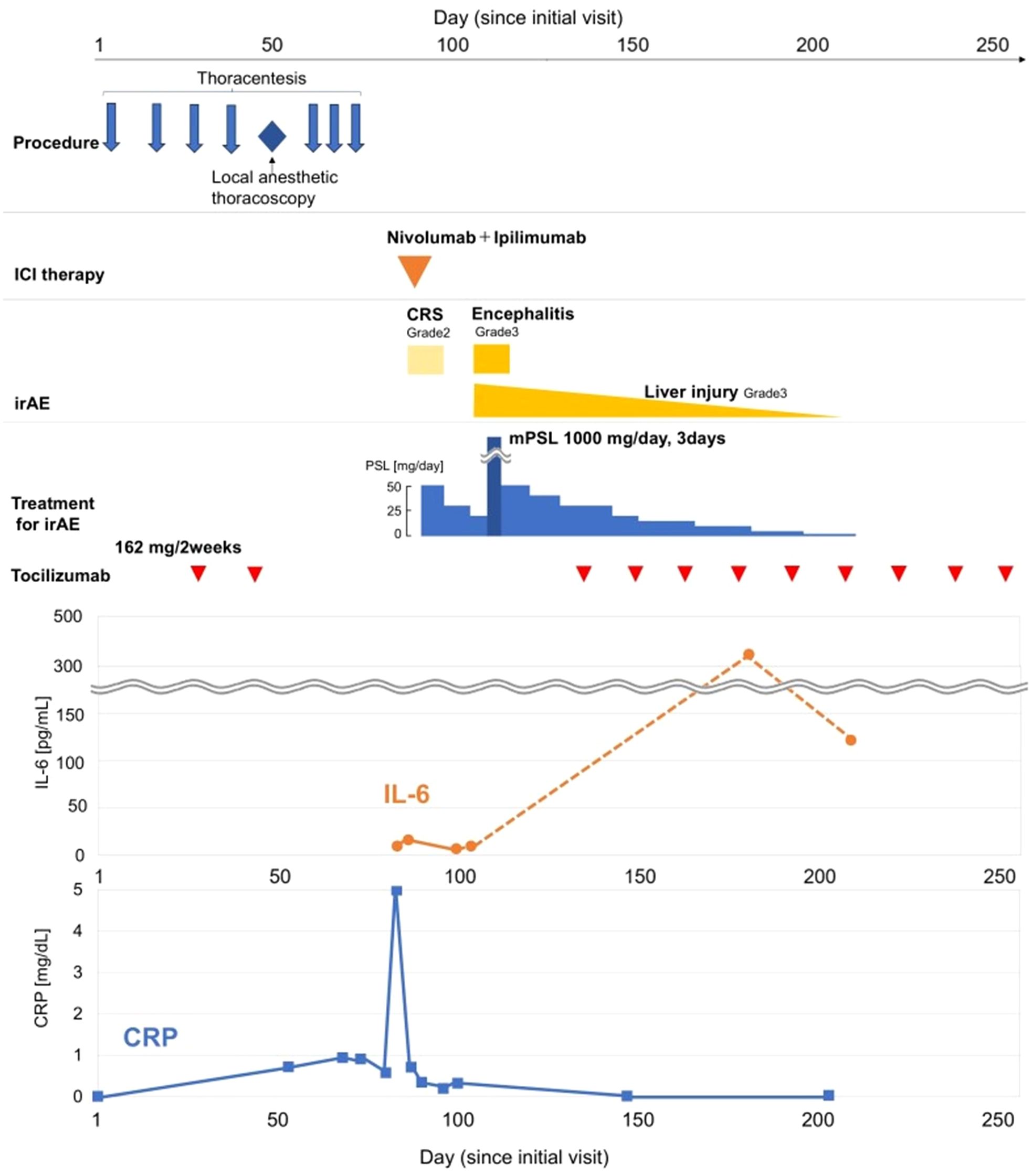 Figure 2. Timeline of the patient’s clinical course. The figure illustrates the clinical course of the patient, from diagnostic procedures to the management of immune-related adverse events (irAEs). The x-axis represents represents the number of days from the patient’s first visit (Day 0). The upper panels depict the timeline of procedures, the administration of nivolumab and ipilimumab on Day 82, and the subsequent onset, and treatment of irAEs, and the corresponding treatments. The lower panel shows the trends of C-reactive protein (CRP, blue line, right axis) and interleukin-6 (IL-6, orange line, left axis) levels.