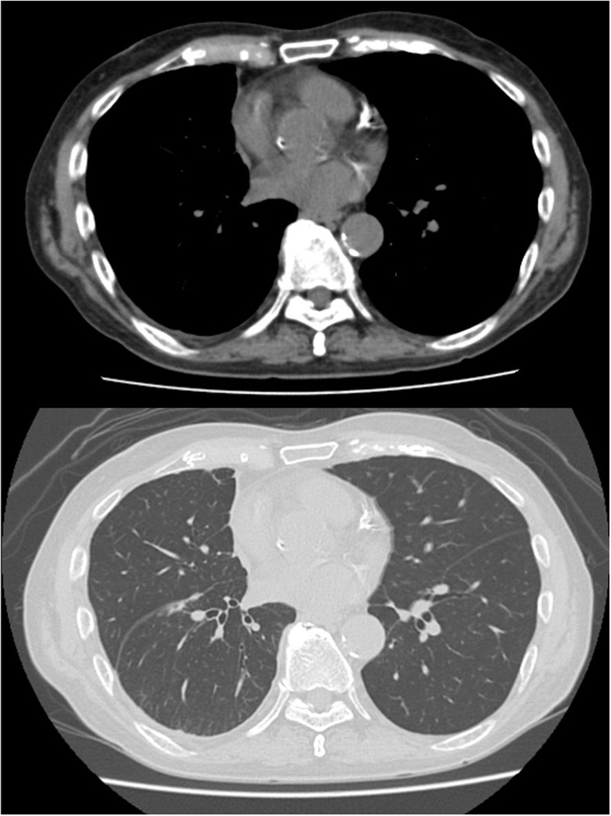 A 74-year-old male was referred to our hospital with a one-week history of dyspnea on exertion, corresponding to grade 2 on the modified Medical Research Council scale.