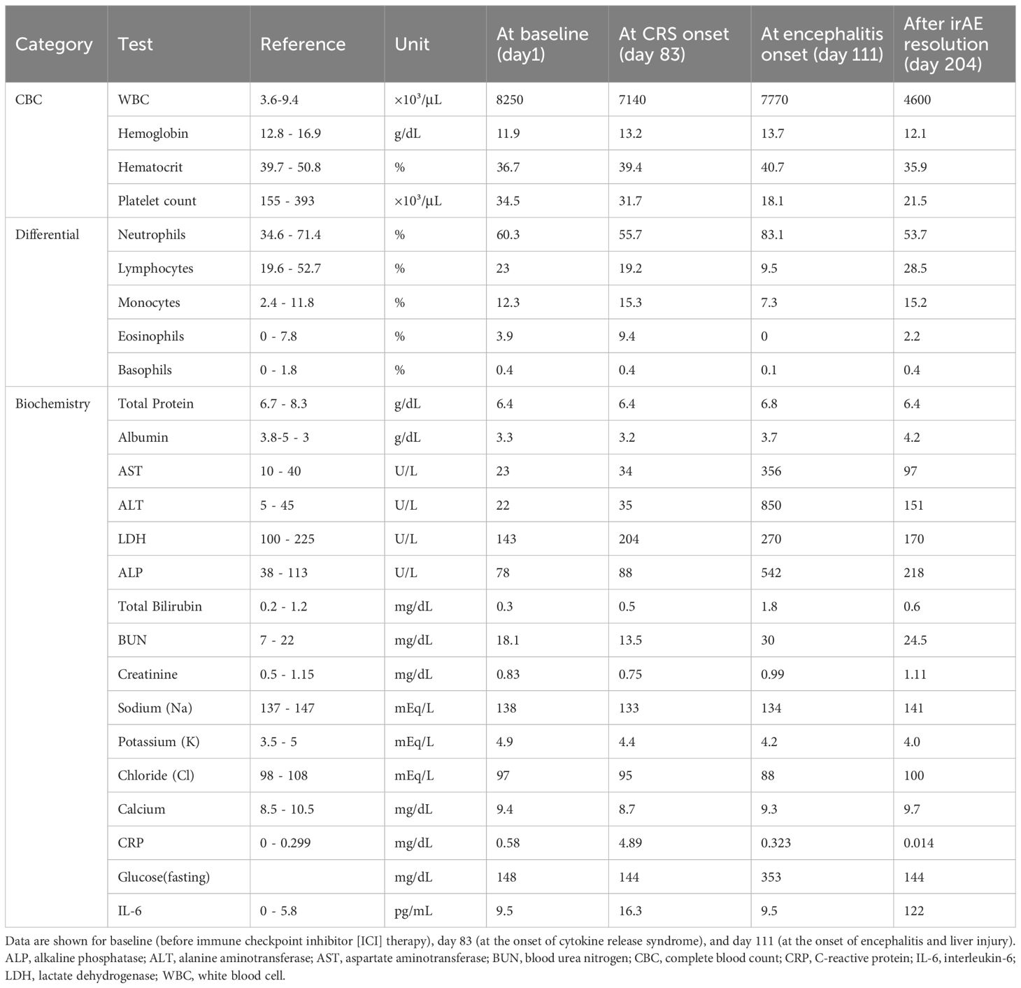 The present case was notable for the occurrence of multiple severe irAEs —including Grade 2 CRS, Grade 3 meningitis, and Grade 3 liver injury—all of which were rapidly controlled with corticosteroids. We hypothesize the residual effects of tocilizumab, administered one month prior for polymyalgia rheumatica (PMR), may have contributed to this favorable course. Tocilizumab’s long, half-life (12, 13)supports this interpretation, as does the observation that IL-6 levels were only mildly elevated during CRS (16.3 pg/mL vs. baseline 9.5 pg/mL) despite marked systemic inflammation (CRP 4.89 mg/dL). This attenuated IL-6 response suggests that persistent receptor blockade may have prevented a more refractory outcome.