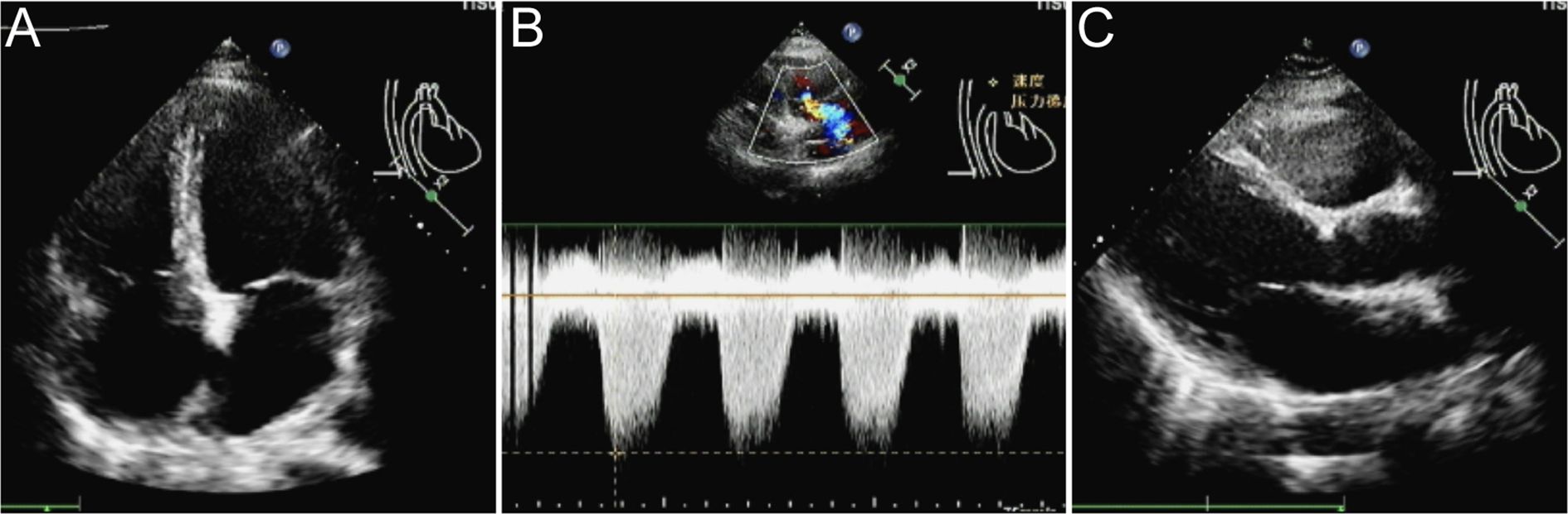 Figure 1. The cardiac ultrasonography. (A) The left atrium was enlarged, with mitral and tricuspid regurgitation. (B, C) The pulmonary artery systolic pressure was 40 mmHg, and the EF was only 44%.