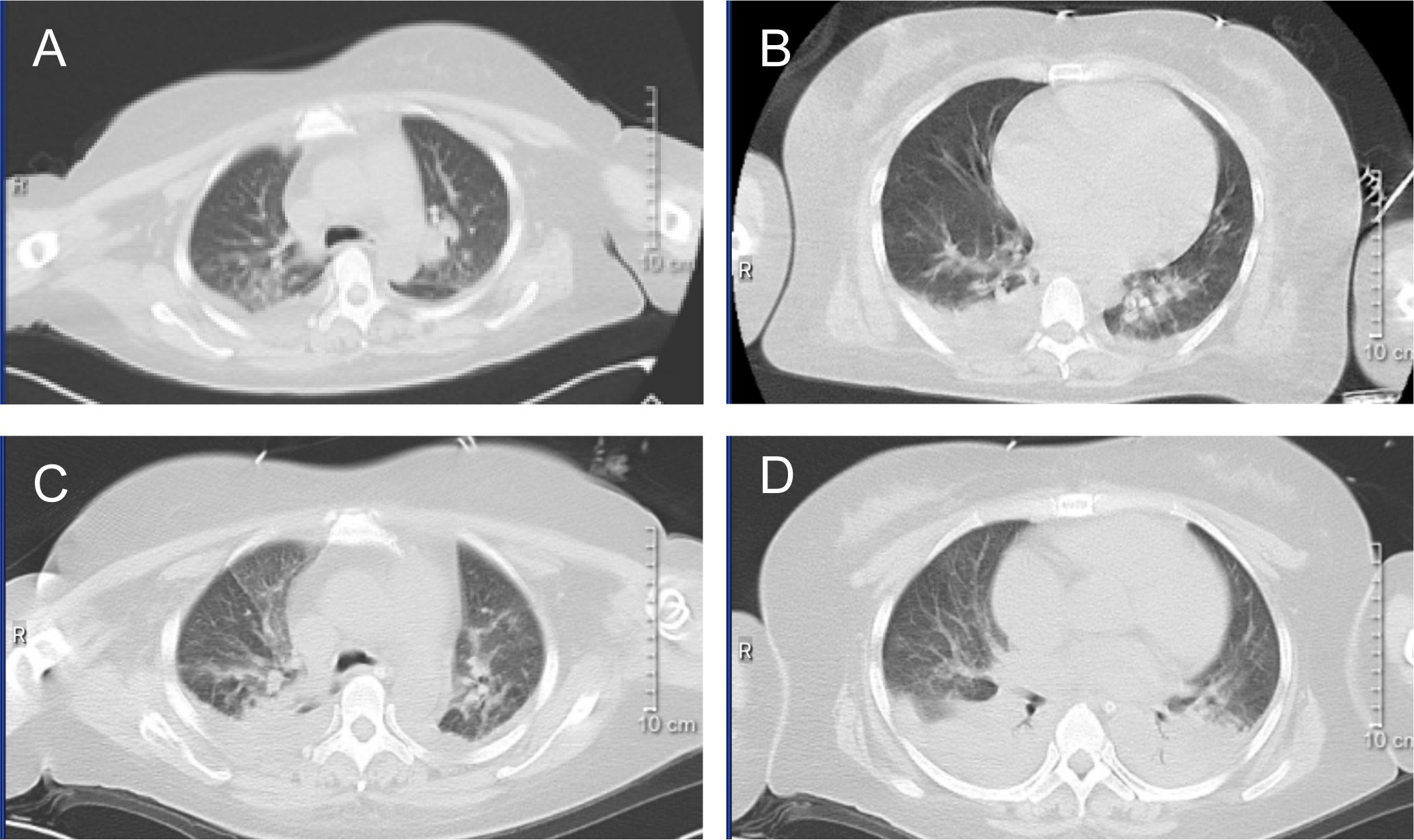 Figure 2. CT image. (A, B) the chest CT image of February 28, 2024. (C, D) the chest CT image of March 3, 2024.