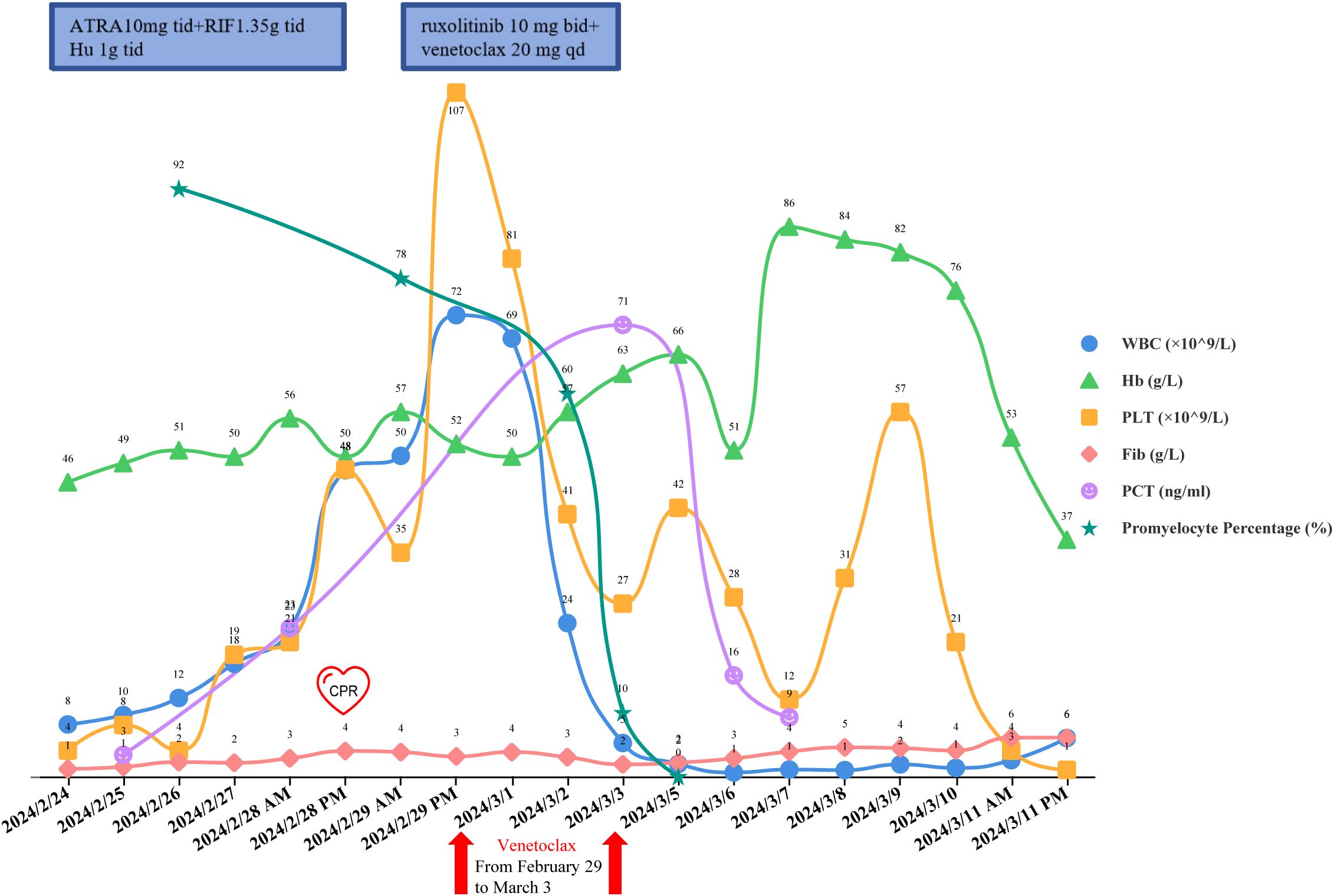 On February 26, the WBC were 12.24×109/L, and on February 27, they increased to 17.59×109/L. A rapid rise in leukocytes often signals the onset of DS. ATRA and RIF were immediately stopped. Given the patient’s lengthy history of schizophrenia, glucocorticoids may worsen the patient’s psychosis. Due to the patient’s lack of cooperation, the use of deep vein cannulation to administer conventional chemotherapy medications to achieve cytoreduction seemed to be extremely challenging. By 6:00 a.m. on February 28, laboratory tests revealed that WBC had increased to 22.91×109/L and procalcitonin (PCT) was 23.17ng/ml. She also experienced dyspnea, chest distress, and palpitation, which prompted us to administer hydroxyurea 1g three times a day, meropenem for antibacterial therapy, and fluconazole as fungal prophylaxis. The Computed Tomography (CT) scan revealed pulmonary edema in both lungs, pulmonary infection, pleural effusion on both sides, and pericardial effusion (Figures 2A, B). The patient’s dyspnea worsened at 8:50 p.m. on February 28 and could not be alleviated by oxygen uptake. The patient unexpectedly experienced heart arrest and loss of consciousness at 21:00. Cardiopulmonary resuscitation (CPR) was done immediately by physicians and nurses, and the patient’s spontaneous heartbeat and respiration returned 5 minutes later, but her consciousness remained in a mild coma. The WBC was up to 47.89×109/L, LDH 6250 U/L, plasma B-type natriuretic peptide (BNP) > 35000 pg/ml, Alanine Aminotransferase (ALT) 111 IU/L, and Aspartate Aminotransferase (AST) 299 IU/L. Cerebral bleeding was ruled out by CT scanning. For advanced life support, the patient was moved from the hematological ward to the intensive care unit (ICU). Given that hydroxyurea was ineffective in cytoreduction, we stopped it. We administered ruxolitinib 10 mg twice daily to ameliorate the cytokine storm syndrome and venetoclax 20 mg once daily for cytoreduction. On February 29, the WBC was 72.16×109/L; on March 1, it was 68.51×109/L; and on March 2, it fell to 23.96×109/L. On March 3, it decreased to 5.19×109/L, and venetoclax was suspended. The patient’s coagulation disorder was controlled during this period by receiving transfusions with fresh plasma, platelets, and red blood cells. After reaching a peak of 9181 U/L, LDH steadily dropped, ALT and AST returned to normal, and creatinine dropped from 573 μmol/L to 134.8 μmol/L. In the peripheral blood smear, the promyelocyte percentage dropped from 92% to 0. However, the PCT rose from the initial 3.34 ng/ml to 23.17 ng/ml and peaked at 70.63 ng/ml, and her temperature was consistently higher than 38°C. A novel hemorrhagic lesion marked by subarachnoid hemorrhage (SAH) was indicated by cranial CT. Bilateral pleural effusion and inflammation in the upper lobes of both lungs were revealed by chest CT (Figures 2C, D). Subcutaneous edema, abdominopelvic effusion, and perirenal exudate in both kidneys were indicated by abdominal CT. Candida albicans was discovered in the patient’s sputum cultures, whereas fungi were suggested by blood cultures. The patient was treated with meropenem, linezolid, voriconazole, and caspofungin. The patient’s temperature progressively dropped to 37.5°C, and the PCT fell from a high of 70.63 ng/ml to 9.21 ng/ml. SAH and bilateral pleural effusions were still suggested by CT on March 5. Laboratory test revealed WBC 1.84×109/L, hemoglobin 82 g/L, platelets 57×109/L, fibrinogen 4.39 g/L, creatinine 121 μmol/L, ALT 71 IU/L, and AST 41 IU/L on March 9, when the patient’s temperature had returned to normal. We restarted ATO 10 mg once daily and ATRA 10 mg three times daily. On March 11, the patient reemerged unexpectedly with a temperature of 39°C, hematochezia, and hematuria. Tests showed WBC 2.51×109/L, hemoglobin 53 g/L, platelets 4×109/L, fibrinogen 6.03 g/L, and creatinine 143.7 μmol/L. We suspended ATRA and ATO, administered ambulatory blood pressure monitoring, red blood cells and platelets transfusion, and treated the hematochezia and hematuria. On March 12, around 21:20, the cardiac monitor showed that the heart rate had decreased to 22 beats per minute and the blood pressure had dropped to 75/31 mmHg. The physicians and nurses performed CPR immediately, but the patient failed to regain spontaneous heartbeat and respiration and was declared clinically dead at 22:00. Two days later, the patient’s sputum culture revealed Ralstonia mannitolilytica, while the blood culture revealed Enterococcus. Figure 3 displayed the changes of WBC, hemoglobin, platelets, fibrinogen, PCT, and the proportion of promyelocytes in the peripheral blood smear.