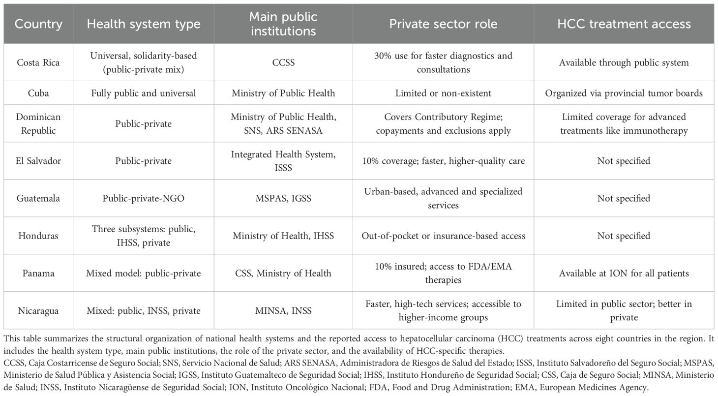 Understanding the structure and characteristics of national healthcare systems is essential to contextualize access barriers and care disparities across Central America and the Caribbean. Information regarding the characteristics of the healthcare systems in the participating countries was predefined and provided by each of the expert respondents. This ensured that the contextual descriptions were accurate and reflective of the national settings in which they practice.