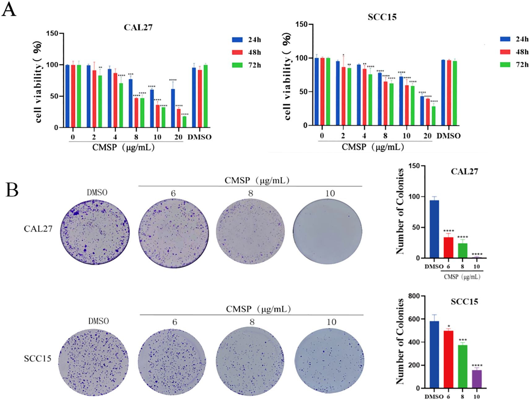CMSP inhibits the proliferation of OSCC cells. (A) The absorbance of CAL27 and SCC15 cells was detected by MTS after 24, 48 and 72h treatment by CMSP. (B) Effects of different concentrations of CMSP (6, 8,10 μg/mL)on the cloning ability of CAL27 and SCC15 cells. n=3, compared with the control group, *P< 0.05, **P < 0.01, ***P < 0.001, ****P < 0.0001.