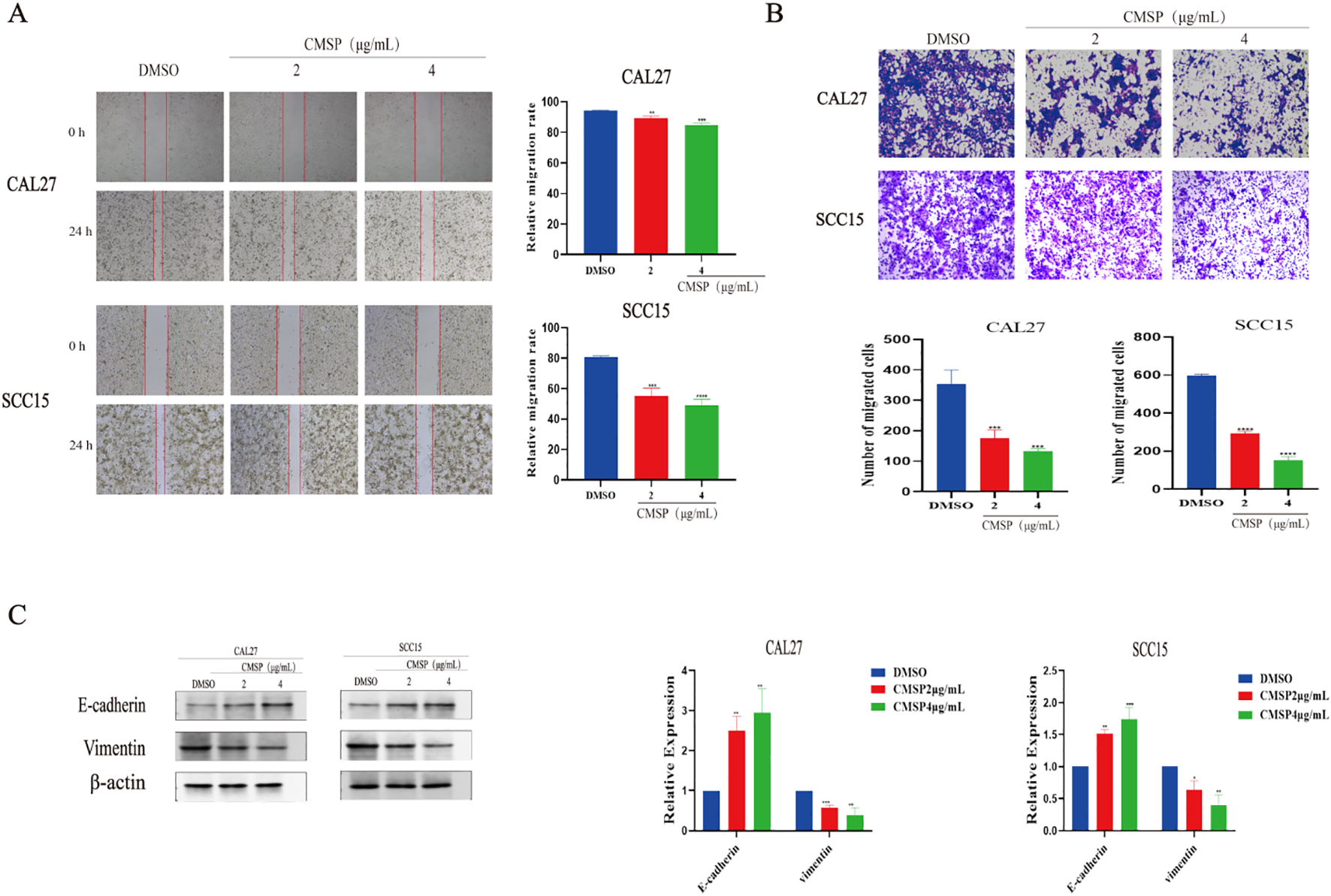 Taken together, the data indicate that CMSP inhibits the migratory and invasive behavior of OSCC cells, at least in part, by interfering with the EMT process. This highlights a potential mechanism by which CMSP may exert its anti-metastatic effects in OSCC.