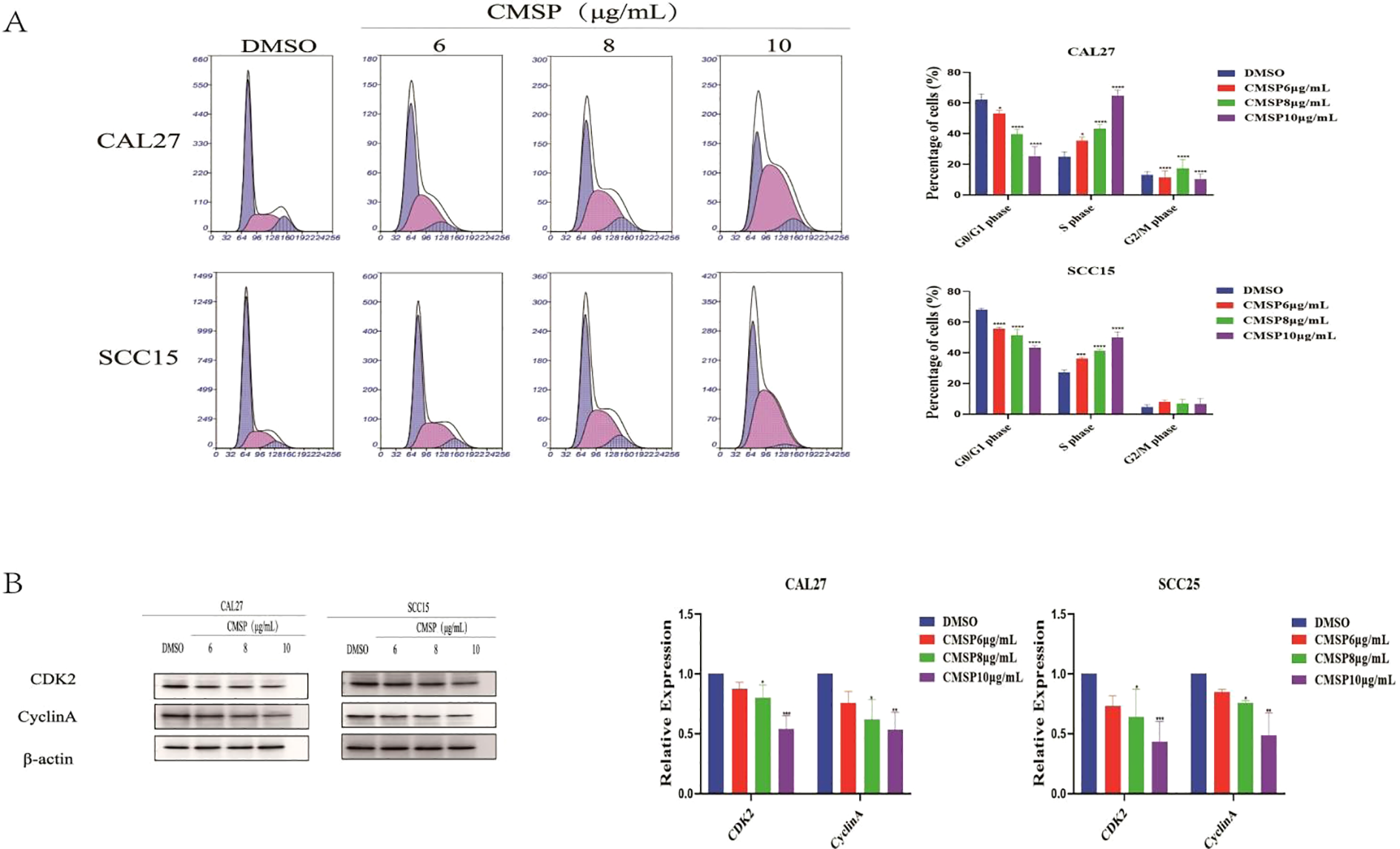 Cell proliferation is tightly controlled by the cell cycle, and disruption of this process is a common mechanism by which anti-cancer agents exert their effects. To explore whether CMSP affects cell cycle progression in OSCC cells, flow cytometry was performed following treatment of CAL27 and SCC15 cells with CMSP at concentrations of 6, 8, and 10 μg/mL for 48 hours. The results demonstrated a significant, dose-dependent increase in the proportion of cells in the S phase, accompanied by a concomitant decrease in the G0/G1 phase population compared to the solvent control group (Figure 4A). These findings indicate that CMSP induces cell cycle arrest at the S phase.