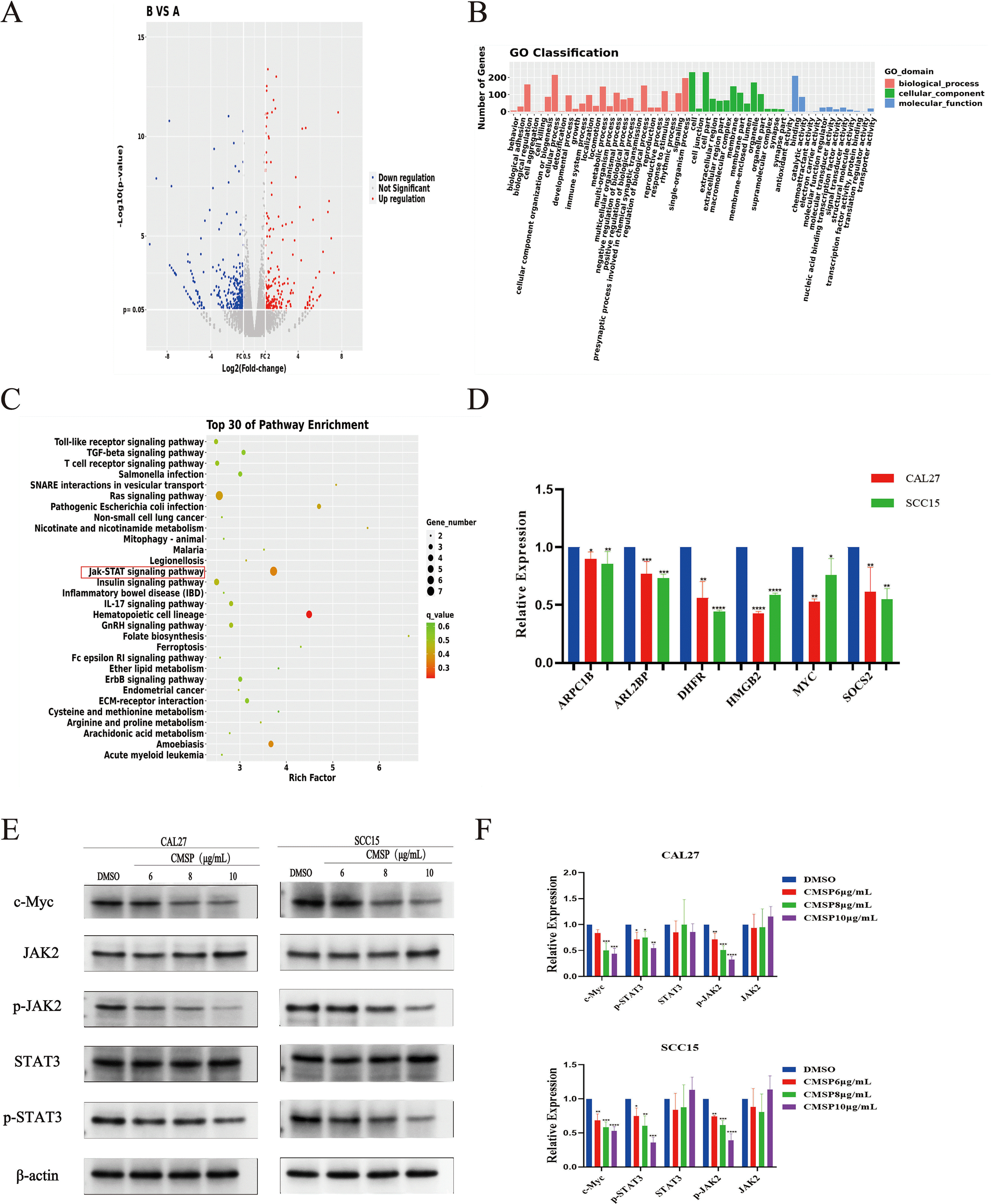 CMSP inhibits cell proliferation through the JAK2/STAT3/c-Myc signal axis. (A)Heat map of differentially expressed mRNA. (B) Enrichment entries of DEGs GO analysis. (C) Enrichment entries of DEGs KEGG pathway analysis(top30). (D) qPCR validation of transcriptome sequence data. (E, F) Effects of different concentrations of CMSP(6, 8, 10)μg/mL on expression levels of JAK2/STAT3/c-Myc signal axis related proteins in CAL27 and SCC15 cells treated for 48h. β-Actin to control the load. n=3, compared with the control group, *P< 0.05, **P < 0.01, ***P < 0.001, ****P < 0.0001.