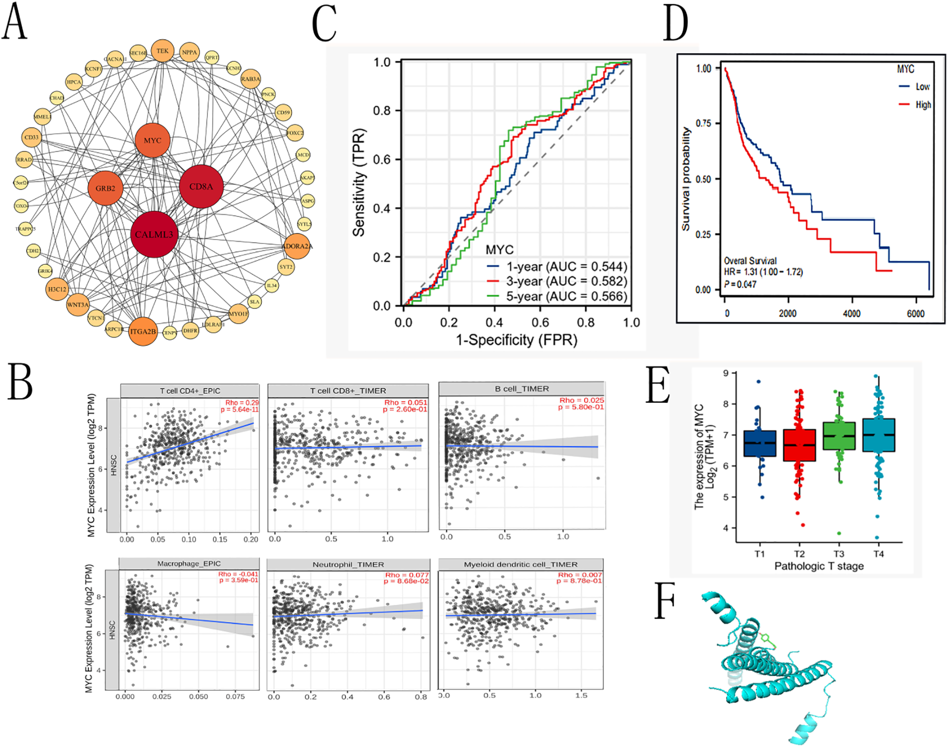 To further explore the potential downstream targets through which CMSP modulates OSCC progression, we analyzed the downregulated genes identified via transcriptome sequencing using the STRING online database to construct a PPI network. The resulting network was imported into Cytoscape for topological analysis and visualization (Figure 6A). In this network, each edge represents a functional interaction between proteins, with denser connections indicating stronger correlations. Core gene analysis identified CALML3, CD8A, MYC, and EGFR as key nodes with high connectivity.