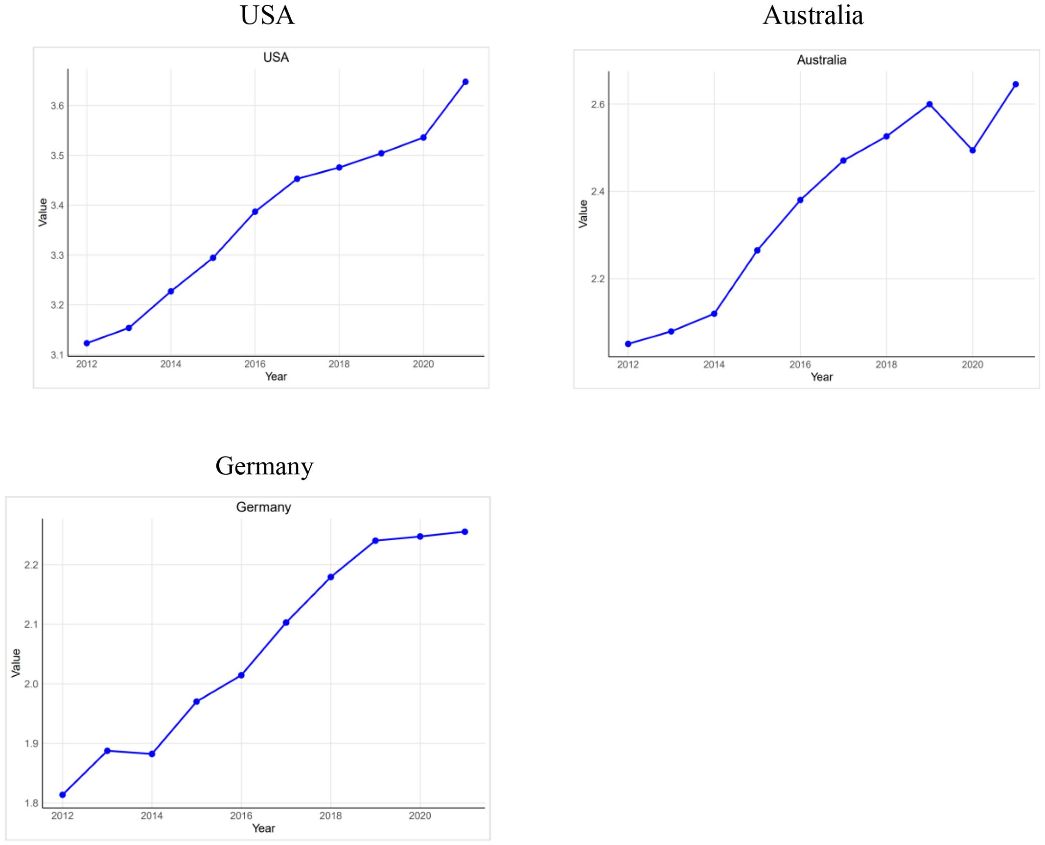 As shown in Figure 1, the USA has the steepest ASR increase, rising from approximately 3.12 in 2012 to 3.65 in 2021. Germany shows a flatter rise, from about 1.81 in 2012 to 2.26 in 2021. Australia falls between the two, increasing from about 2.05 in 2012 to 2.65 in 2021.