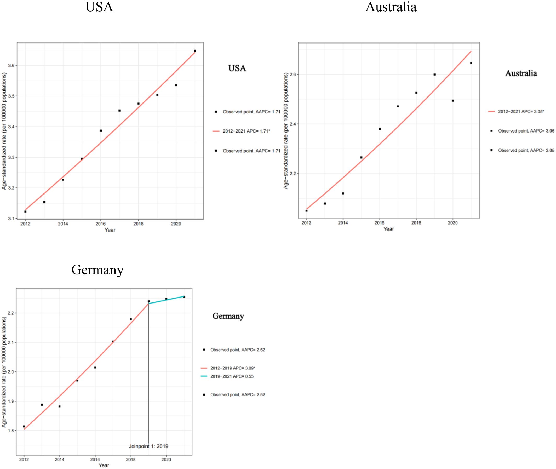 From 2012 to 2021, the USA had identical AAPC and APC values of 1.71. Australia showed higher trends, with both AAPC and APC at 3.05 over the same period. Germany displayed distinct temporal patterns: an APC of 3.09 during 2012–2019, slowing to 0.55 in 2019–2021, yielding an overall AAPC of 2.52. ASRs rose in all three countries, with the steepest increase in Australia. Germany’s growth slowed markedly after 2019, while the United States maintained a modest, steady rise (Figure 2).