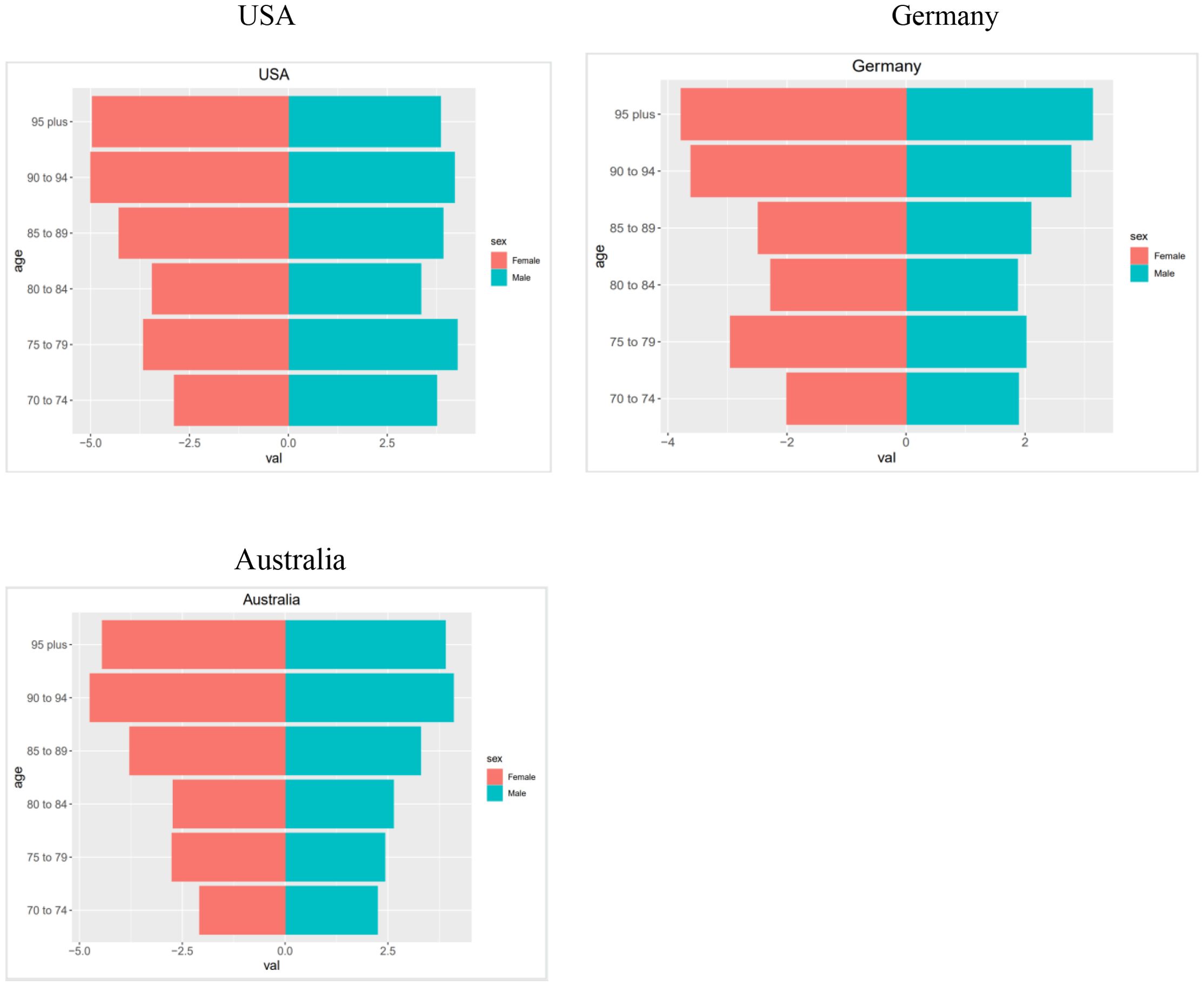 Next, we calculated the ASR and plotted the ASR curves for different populations. The ASR in the USA grew the fastest, indicating that the health burden of its elderly population grew the fastest and that more active public health policies were needed. Germany’s ASR grew more slowly, reflecting the effectiveness of its medical system and social policies, but continued attention should be paid to the health of its elderly population. Australia’s ASR growth was intermediate, suggesting the need to strengthen health management and resource allocation to meet the challenges of ageing. Overall, the rising trend in ASR in the three countries reflects the increasing health burden of the elderly population, but the rate of growth and the reasons for it are different. Countries should formulate appropriate health policies and interventions according to their own conditions to meet the health challenges of an aging society.