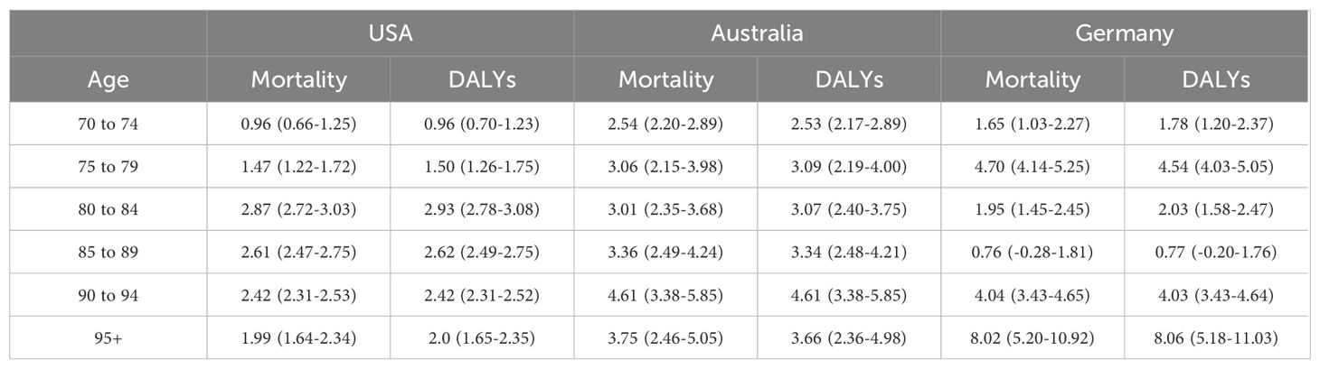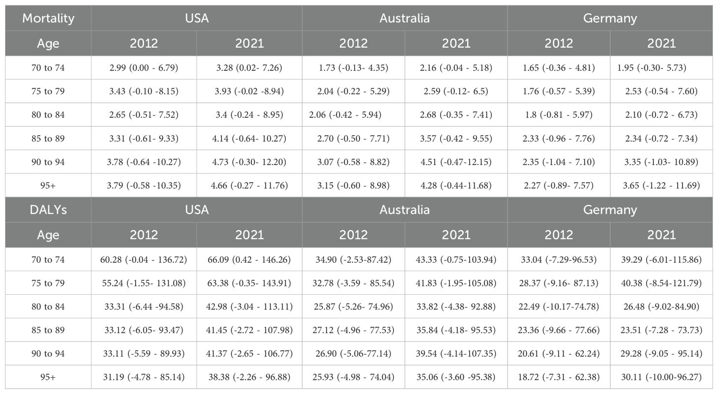 According to Table 1, BMI-related PC mortality among adults aged 70 years or older increased from 2012 to 2021 in the United States, Australia, and Germany. The United States saw the largest rise; among those aged 95 years or older, BMI-related PC mortality increased from 3.79% to 4.66%. Australia also recorded substantial growth, with the 90–94 age group rising from 3.07% to 4.51%. Germany’s increase was smaller; among those aged 95 years or older, BMI-related PC mortality rose from 2.27% to 3.65%. Over the same period, DALYs among adults aged 70 years or older increased in all three countries. The largest gains occurred in the United States, where DALYs in the 70–74 age group rose from 60.28 to 66.09. Australia also showed notable increases in the 70–74 age group (34.90 to 43.33). In Germany, the increase was smaller but evident in those aged 95 years or older (18.72 to 30.11).
