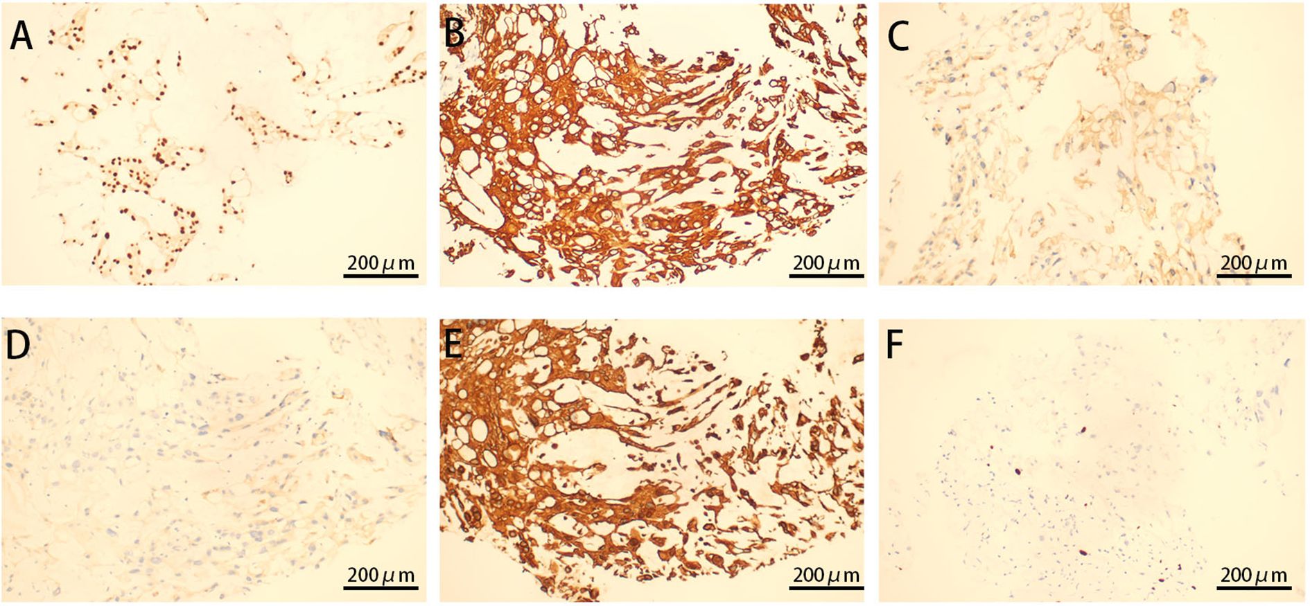 Figure 4. Immunohistochemistry of cystic tissue. Diffusely intense immunostaining for brachyury (A), CK (B), S100 (C), EMA (D), VIM (E), and ki67 (F) expression is displayed (original magnification ×200).