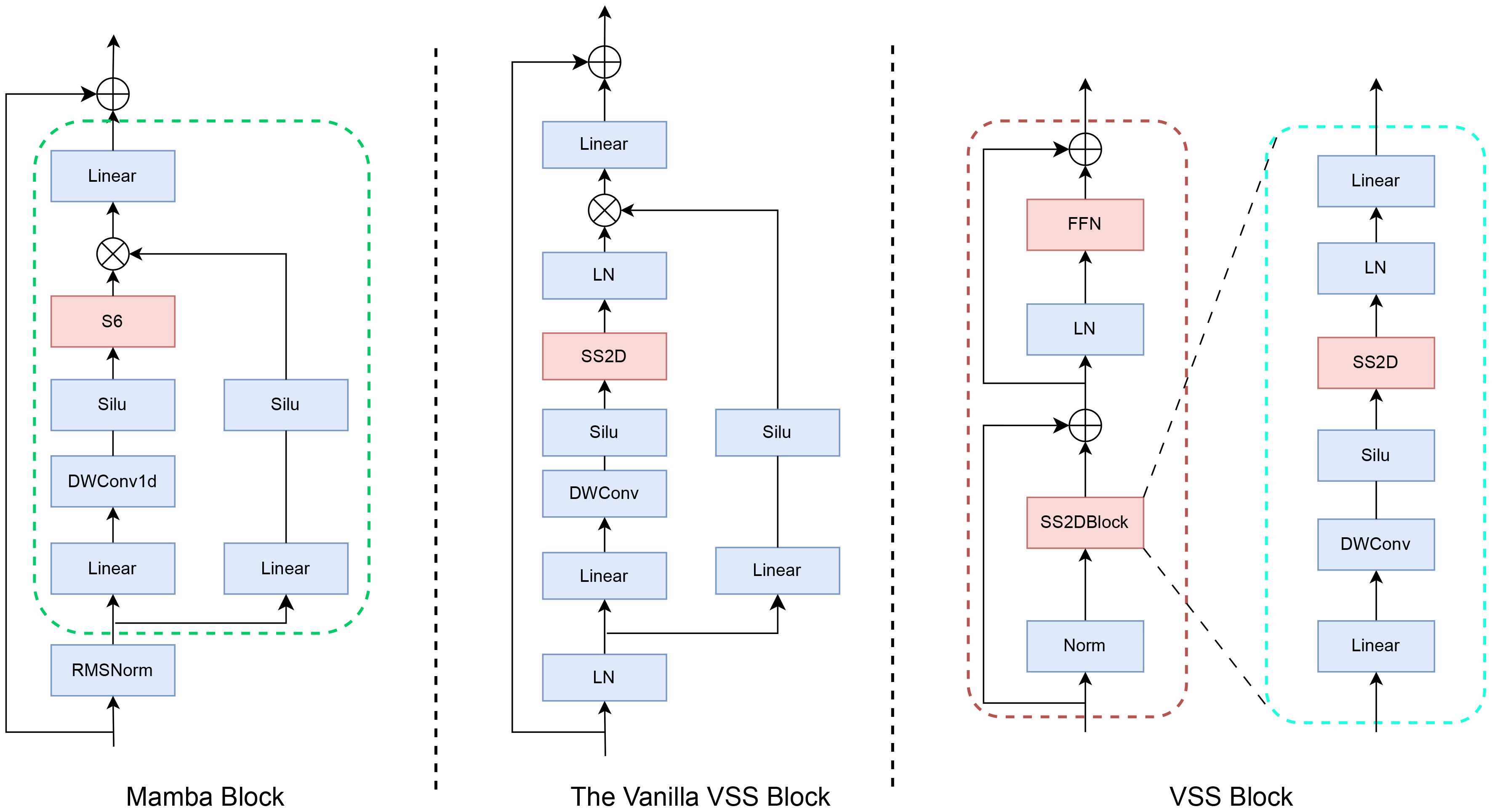Figure 1. Structures of the Mamba block (left), the Vanilla VSS block (middle), and the VMamba (VSS) block.
