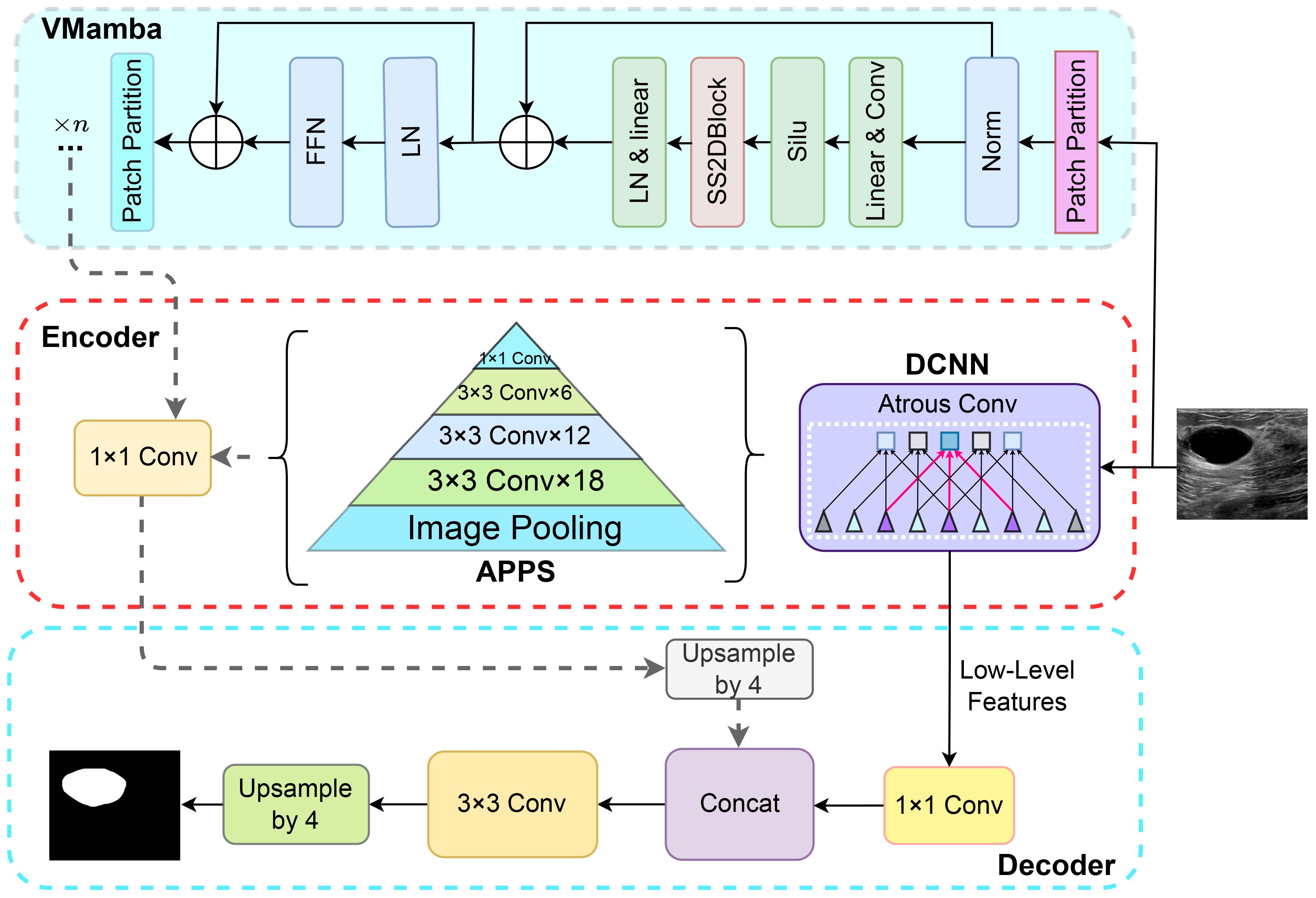 To further enhance segmentation models, researchers are exploring novel network architectures like dense connections (12), residual blocks (13), and attention mechanisms (14). Kumari et al. (15) utilized a neural network with a dense connection known as Densely Connected Convolutional Network (DCCN) to identify deep liver irregularities; (16) introduced a deep learning architecture (MRFB-Net) that leverages an attention-based pooling decoder module to enhance the segmentation of uterine fibroids in preoperative ultrasound images. However, common CNN models face limitations in their ability to model long-range interactions, and Transformers are constrained by their quadratic computational complexity, making them less than satisfactory for processing breast ultrasound images. This has led to the emergence of State Space Models (SSM) (17, 18), represented by Mamba, as a promising solution. The Mamba model excels not only in modeling long-range interactions but also in maintaining linear computational complexity. It specifically improves the S4 state space model through selective mechanisms and hardware-aware algorithms, excelling in processing long-sequence data with its unique features. By integrating the cross-scan module (CSM) into the visual state space model (VMamba), Mamba enhances its applicability to computer vision tasks by spatially traversing the domain (17). (19) proposed the Shuffle-Reshuffle Gradient Mamba (SRGM) tailored for MMIF, and designed the Local and Global Gradient Mamba (LGGM) to extract modality-specific features while retaining rich spatial details. (20) introduced Semi-Mamba-UNet, which integrates a pure vision-based Mamba-based U-shaped encoder-decoder architecture with the traditional CNN-based UNet into a semi-supervised learning (SSL) framework and tested it on the ACDC and PROMISE12 medical imaging datasets. (21) introduce Edge-Mix enhanced Mamba (EM-Mamba) for kidney segmentation, which is designed to capture global and local information from multi-scales. EM-Mamba leverages SegMamba as its backbone, utilizing Mamba’s efficiency in extracting long-range dependencies. Although Transformer models excel at global modeling, their self-attention mechanism requires a computational complexity that is quadratic with respect to the image size (22), which becomes particularly evident in the task of medical image segmentation that demands dense predictions. Building on these advancements, our goal is to enhance long-sequence data processing by integrating Mamba into foundational models like UNet++ (23) and DeepLabv3+ (24), aiming to improve breast ultrasound image segmentation.