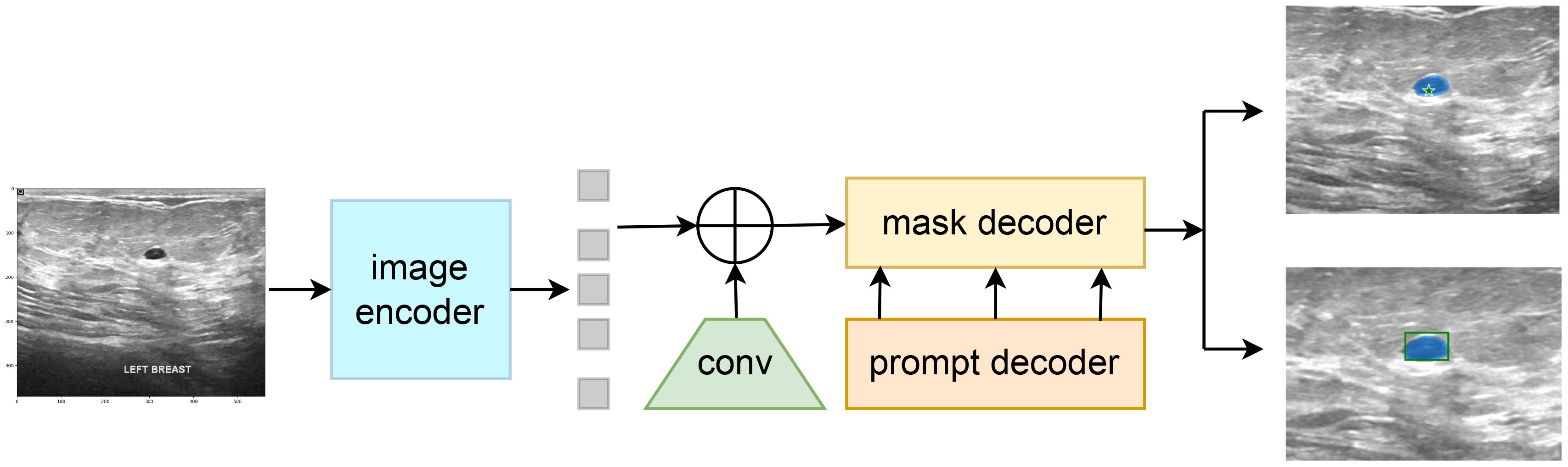 The Segment Anything Model (SAM) model is tailored for a novel image segmentation assignment, trained on a dataset of 11 million images with over one billion masks. Moreover, SAM can segment images based on various prompts such as points, boxes, and text, without the need for retraining on specific datasets. Its efficient design and training facilitate zero shot transfer to new image distributions and tasks, which has garnered widespread attention. For instance, Ma and Wang et al. (35) proposed MedSAM for general medical image segmentation. This model, trained on a meticulously constructed dataset, is capable of achieving desirable performance. However, the limited scale of the assembled dataset and the modality imbalance issue restrict MedSAM’s performance on ultrasound images. The MSA method proposed by Wu et al. (36) significantly enhances image segmentation performance by freezing the pre-trained parameters of SAM and inserting adapter modules at specific locations. As shown in Figure 4, the SAM model comprises an image encoder, a prompt encoder, and a mask decoder, the SAM model employs a prompting approach to segment user-specified points. Users can provide prompt information through user-defined points, bounding boxes, and randomly circled regions. Furthermore, free-form text prompts are utilized to present initial results. Notably, the prompt encoder of the SAM model can effectively segment desired objects based on user prompts, thereby enabling targeted area segmentation. For the segmentation of breast ultrasound images, Tu et al. (37) proposed an innovative SAM adapter (BUSSAM), which migrates the SAM framework to the field of breast ultrasound image segmentation through adaptation techniques, and validated its feasibility and effectiveness.