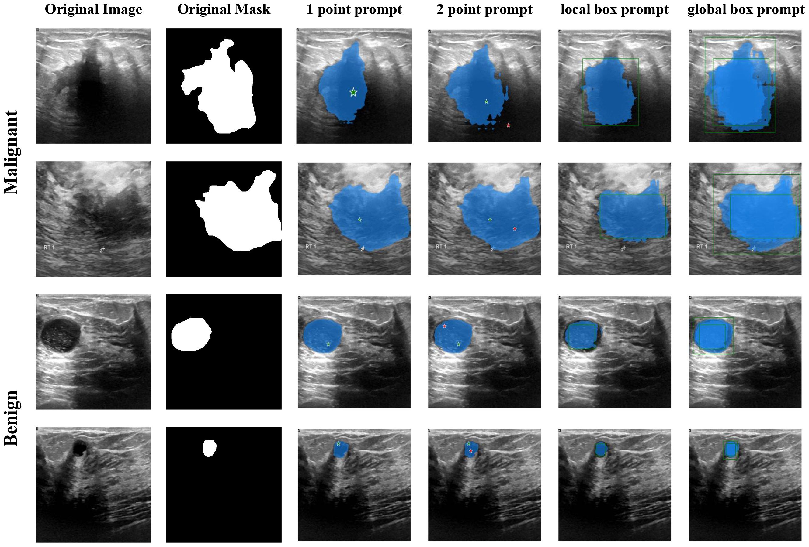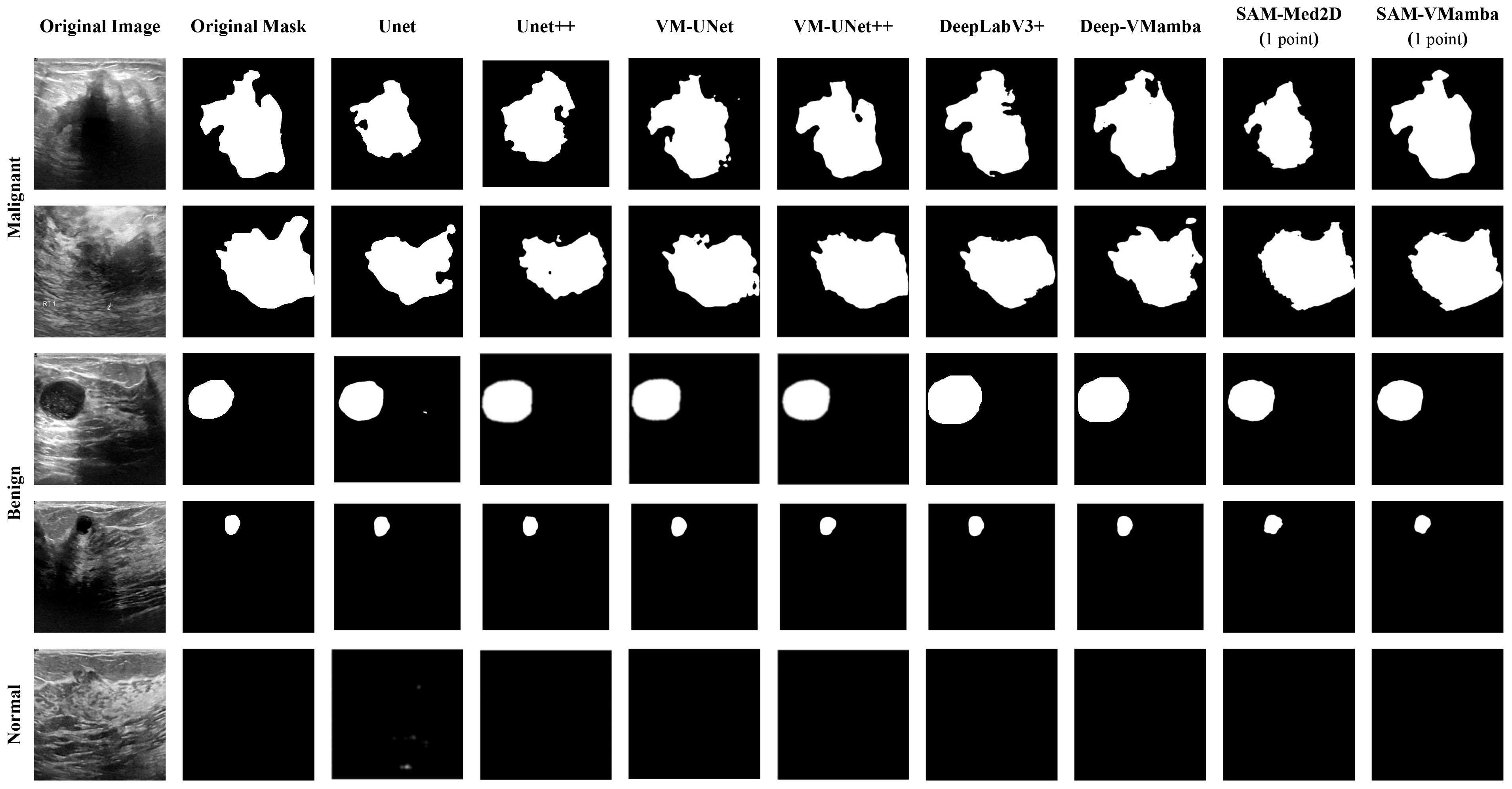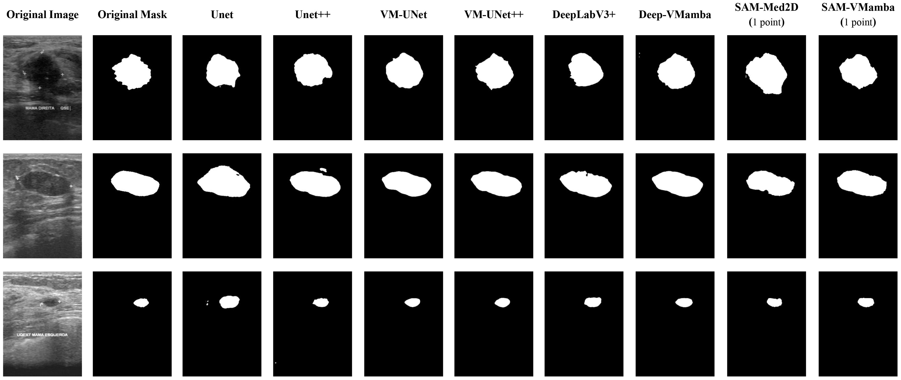 Figures 6 and 7 visualize the actual segmentation results of each model on breast tumors. Traditional models exhibit poor performance in segmentation due to the limitations of their structure. The pooling layers and downsampling operations used in network training result in the loss of partial information as the network depth increases and size decreases. In contrast, during upsampling, only a basic addition operation is conducted on high-resolution images from the downsampling layer, leading to the loss of crucial “deep-layer” feature information. However, Mamba, characterized by its capacity for ultra-long sequence processing and memory within the integrated model, preserves more spatial details, thereby yielding superior segmentation outcomes. SAM-VMamba demonstrates superior performance with small-sample data due to its integration of the SAM segmentation model. Furthermore, as illustrated in Figure 8, the distinctive prompt encoder of SAM enables precise regional segmentation of images, enhancing its practical utility by eliminating the need to process redundant image components.