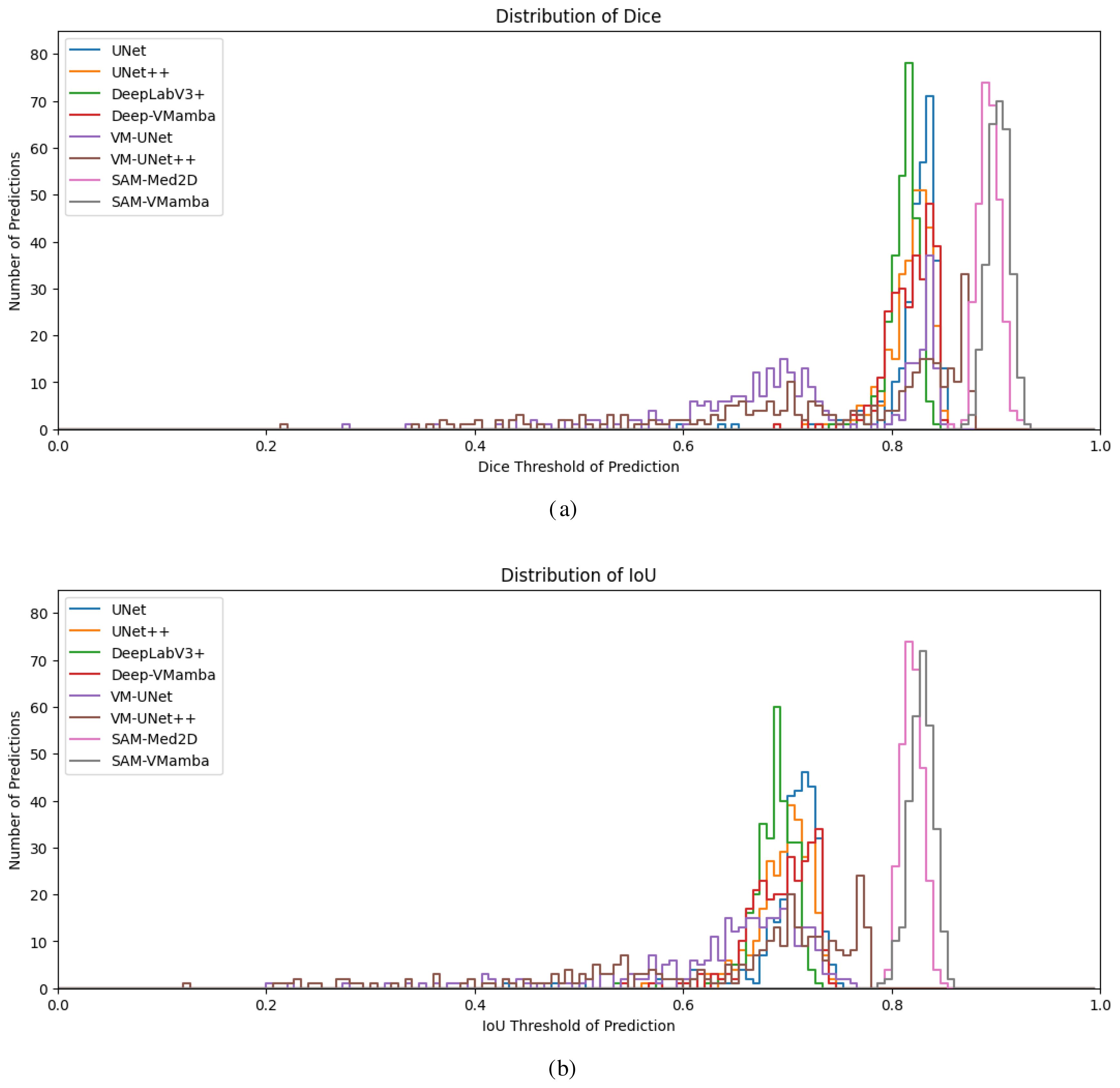 Figures 9a, b depict the cumulative distribution of prediction effects for each model based on 300 segmentation predictions of breast ultrasound images. The segmentation outcomes of conventional models such as U-Net predominantly cluster around 0.8 for Dice and 0.7 for IoU. The integration of the Mamba model notably enhances the overall segmentation performance, yielding higher accuracy metrics compared to the baseline models. Particularly noteworthy is the superior segmentation efficacy of the SAM model surpassing that of its counterparts. The SAM model demonstrates heightened segmentation accuracy and data concentration, indicative of its robust stability. The primary reason lies in the prompt encoder mechanism of the SAM model and its pretraining on large-scale datasets, which enable superior adaptation and handling of out-of-domain datasets. In contrast, baseline models suffer from a substantial loss distance between their initialized weights and the optimal solution, requiring large sample sizes and extensive iterations to reduce this gap, thereby leading to unstable extrapolation in prediction distributions. Moreover, models augmented with the Mamba structure further enhance the multi-scale spatial decomposition of breast tumor images and the modeling of intra-scale feature dependencies, thereby facilitating the extraction of tumors with varying shapes and types.