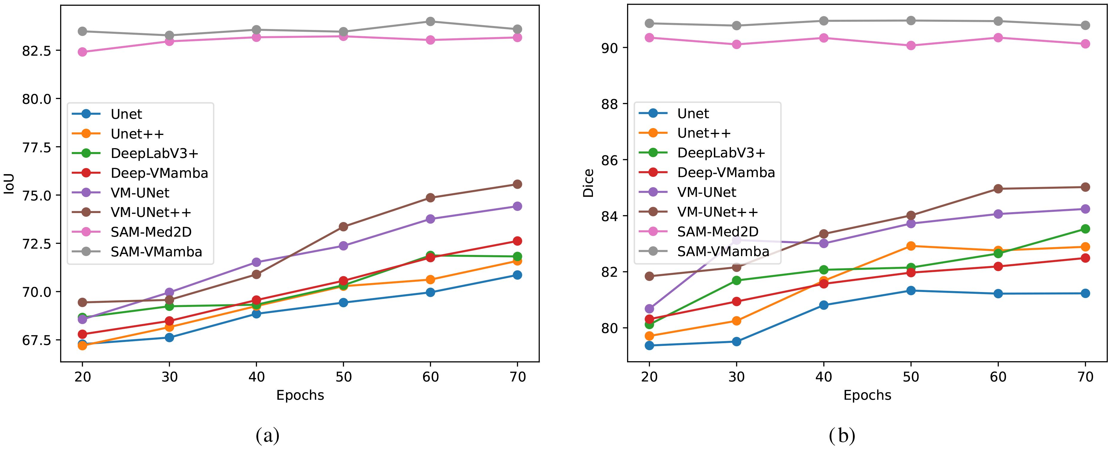 The Figures 10a, b illustrates notable enhancement in the model’s performance with the integration of the Mamba structure compared to the original model. Specifically, the incorporation of this structure significantly improves the segmentation performance of the model on breast ultrasound images with long sequences. With an increase in the number of training iterations, conventional models like Unet exhibit some degree of enhancement. However, the integrated Mamba model surpasses the performance of individual traditional models in overall improvement. Particularly noteworthy is the superior segmentation performance of the SAM model compared to other models, attributed to its pre-training on a large dataset of millions of images. This model requires only a limited number of training epochs to achieve a stable and optimal performance level.