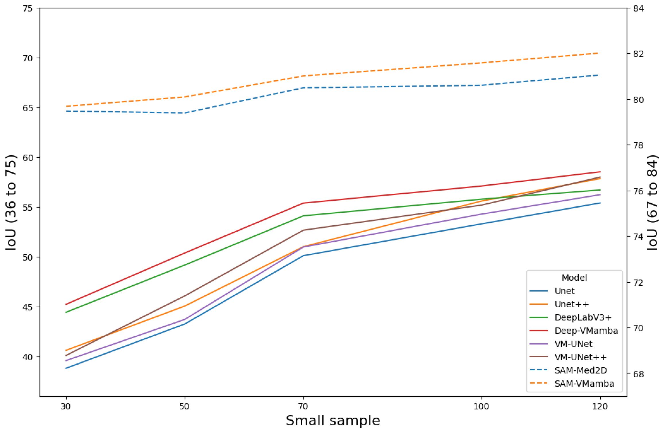 Figure 11 presents the performance of all models under few-sample testing conditions. Findings indicate that when trained on a small dataset, the model incorporating VMamba blocks generally outperforms the baseline model in segmentation accuracy. The primary reason is that breast tumors exhibit a relatively low signal-to-noise ratio and indistinct features, which forces baseline models to rely on large sample averaging to suppress noise. In contrast, Mamba compresses two-dimensional spatial sequences into fixed-dimensional state vectors, inherently embedding a Gaussian–Markov smoothing mechanism that provides natural denoising. These advantages collectively enable the Mamba-enhanced model to achieve an average improvement of 9.12% in the IoU metric. Remarkably, despite being pretrained on extensive data, the SAM model exhibits sustained high segmentation performance in the context of limited-sample training, maintaining an IoU value of approximately 80%.