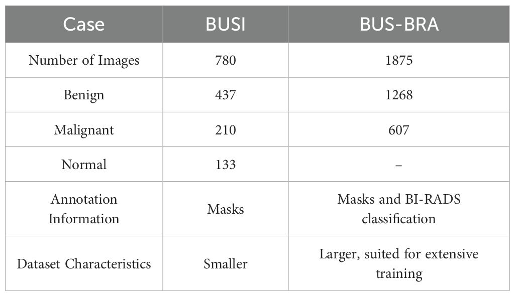 The study leveraged data from two publicly available datasets: BUSI (29) and BUS-BRA (30). The BUSI dataset comprises breast ultrasound images and their corresponding label images, collected from 600 women aged 25 to 75 in 2018. Each original image is paired with a tumor image (mask), with benign and malignant samples typically featuring one or two lesions. As a result, the labels outlining the lesion areas may require overlapping to consolidate multiple lesions into a single label. The BUS-BRA dataset includes 1875 anonymized breast ultrasound images from 1064 patients, with 722 benign and 342 malignant tumors. It provides BI-RADS assessments, manual segmentations, and 5- and 10-fold cross-validation partitions for standardized evaluation of CAD systems. The detailed information of the dataset is shown in Table 1.