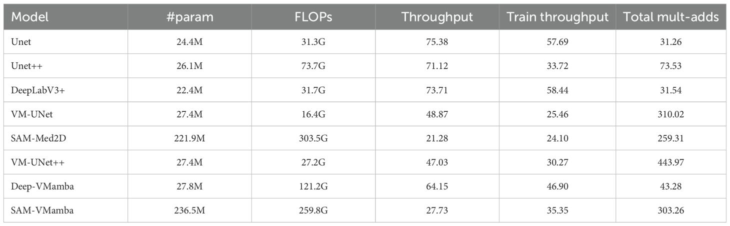 Table 2 summarizes the training hyper-parameters and computational performance of each model. Where, throughput denotes the maximum number of training samples the model can process per second, while total multiply-adds signify the computational burden of the model during a single forward propagation. The exceptional long-sequence processing capabilities of Mamba are confirmed through an assessment of the computational efficiency of output images. This evaluation involves comparing parameters, processes, and throughput during both training and inference to gauge generalization performance. Results indicate that models incorporating Mamba exhibit consistent performance across various input image sizes. For instance, at an input resolution of 512 × 512, Unet++ achieves the highest throughput among baseline models, while DeepLabV3+ demonstrates the highest throughput per epoch during training. Despite higher computational load compared to baseline models at the same input size, the integration of the Mamba structure allows for increased throughput capacity, enabling the retention and processing of longer data sequences, thereby enhancing comprehensive image data processing. Moreover, while the integrated models maintain relatively high inference speeds (higher throughput than baseline models) at a resolution of 512×512, their computational load escalates significantly, surpassing that of baseline models and indicating limited generalization capability. In terms of computational efficiency, current SSM-based vision models typically exhibit superior throughput only with large-scale inputs and high resolutions.