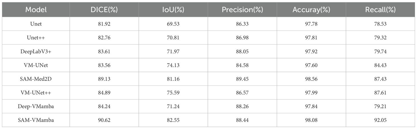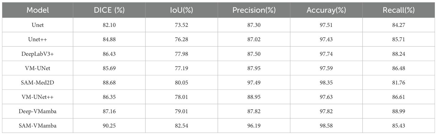 The model proposed in our study is deployed and trained on the RTX A6000 GPU, with all experiments conducted using the same hardware device. The experiments utilize the PyTorch 2.2.0 deep learning framework and Python 3.11.5 programming language, with GPU computation supported by the CUDA 12.2 architecture. The batch size is set to 24, with a maximum of 100 training epochs, and the AdamW optimizer is employed in conjunction with the CosineAnnealingLR learning rate scheduling strategy for model optimization. Additionally, the proposed SAM-VMamba network is initialized using the pre-trained weights of SAM’s ViT-B.