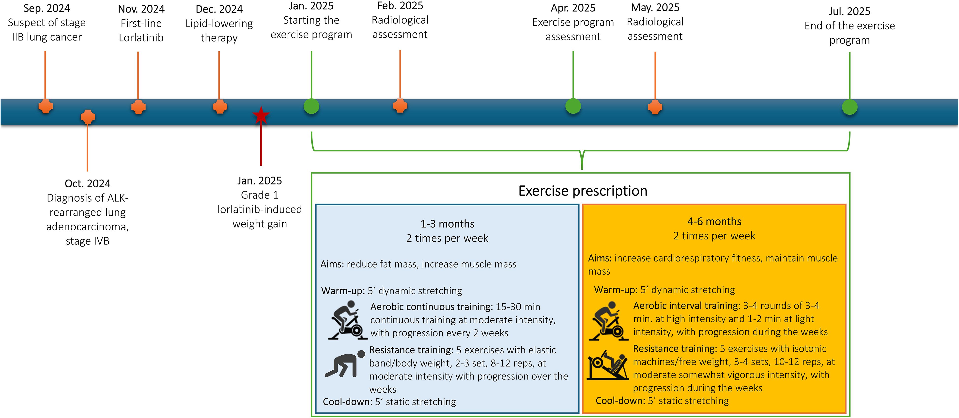 To manage this side effect, pharmacologic interventions have been preliminarily proposed. While glucagon-like peptide-1 receptor agonists (GLP-1 RAs) have been demonstrated to be efficacious in weight control in non-cancer populations (2), to date, only one case report assessed the effect of GLP-1 RAs on alectinib-induced weight gain. Despite the effective weight management, it was simultaneously observed that the TKI exposure decreased by one-third, potentially suggesting a negative effect on anti-cancer treatment efficacy (9). Further studies are required to explore the potential interactions between GLP-1Ras and TKIs, but at the same time, other options may be available to manage weight gain in patients with cancer. Physical exercise is essential for determining the caloric balance and thus shaping body composition. In patients with lung cancer, such interventions have been investigated, demonstrating a favorable safety profile and efficacy in improving physical function, as well as benefits in managing various symptoms and side effects, and in modulating muscle mass and adipose tissue (10). However, despite the strong rationale, to our knowledge, no studies have explored exercise as a potential intervention to manage TKIs-induced weight gain. In this context, we report the impact of a 6-month intervention combining tailored exercise in a patient affected by advanced ALK+ NSCLC, as treatment for counteracting lorlatinib-induced weight gain.