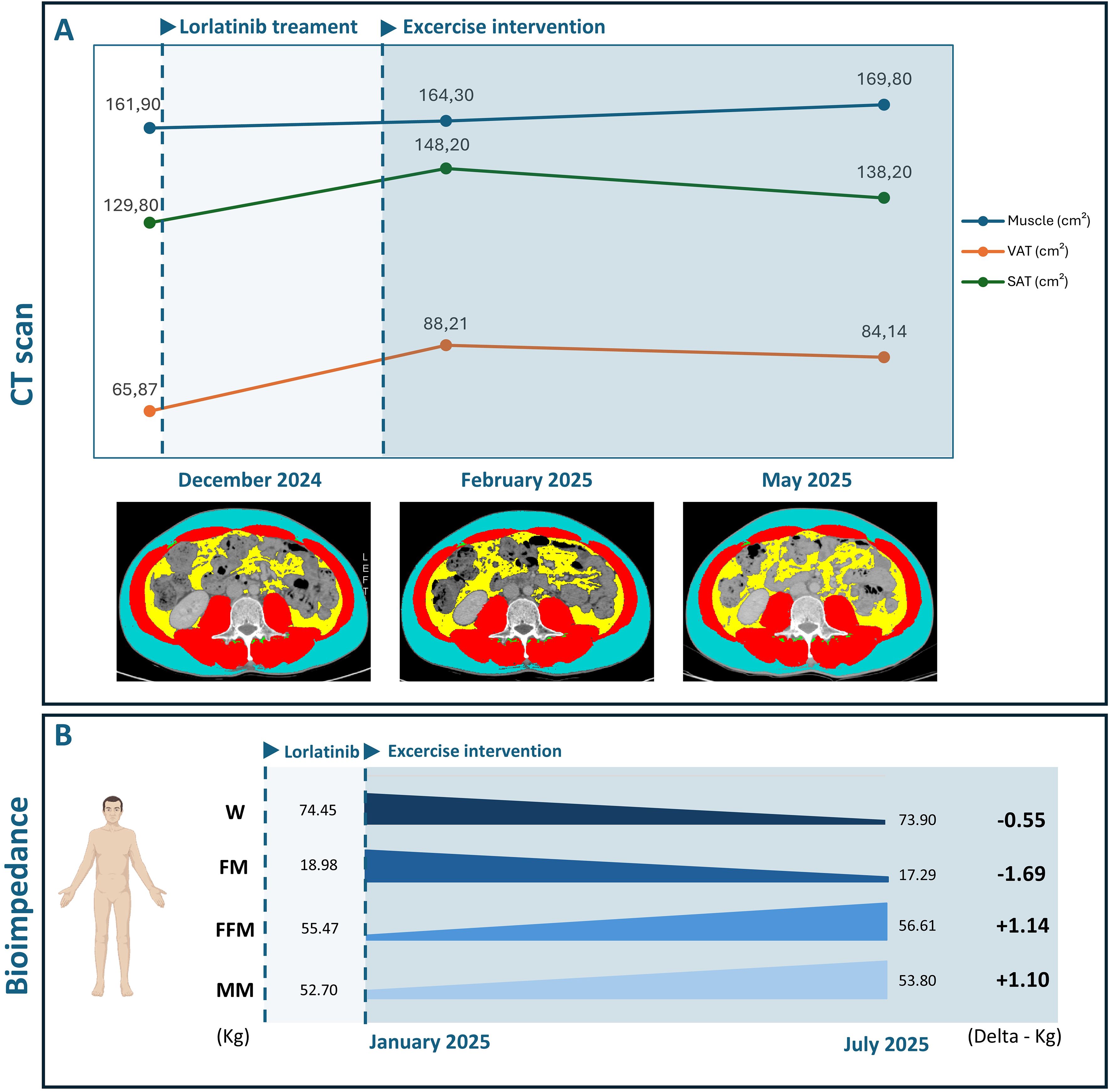 In September 2024, a 43-year-old never-smoker man of Asian ethnicity and without relevant comorbidities, due to the onset of dyspnea and persistent cough, underwent a contrast-enhanced chest CT scan, which revealed a solid 6 × 4 cm nodule in the left lower lobe. Staging was completed with a contrast-enhanced brain CT and 18F-FDG PET scan, which confirmed the presence of the pulmonary lesion without evidence of distant metastases [stage IIB (cT3 N0 M0), according to the 8th edition of the TNM classification]. Histological typing was performed via tracheobronchoscopy, which confirmed the diagnosis of ALK-rearranged lung adenocarcinoma, detected by next-generation sequencing (NGS). In October 2024, during exploratory thoracoscopy, metastatic involvement of the pleura and diaphragm was identified and subsequently confirmed by intraoperative frozen section histological examination. Consequently, lobectomy was deferred. Subsequent CT total body imaging revealed multiple pleural lesions [stage IVB (cT3 Nx M1c] and first-line targeted therapy with lorlatinib 100 mg/day was initiated in November 2024 (Figure 1). At the 4-week follow-up, a grade 1 elevation in both cholesterol (214 mg/dL) and triglycerides (246 mg/dL) was observed, prompting the initiation of lipid-lowering therapy (rosuvastatin 5 mg and fenofibrate 145 mg). Approximately 1.5 months after starting lorlatinib, the patient had gained 6 kilograms (kg) of body weight, resulting in a grade 1 weight gain. CT scans at 3 and 6 months showed a reduction in all known disease lesions, with a partial response, according to RECIST 1.1, as the best response. Body composition analysis through CT scan revealed a considerable increase in visceral and subcutaneous adipose tissue after 3 months of lorlatinib treatment compared with the baseline evaluation (Figure 2A). The patient continues lorlatinib with good tolerance, but to manage the side effect of weight gain, was referred to the specialized exercise service. In this light, in January 2025, the patient was invited to participate in a 6-month exercise intervention.