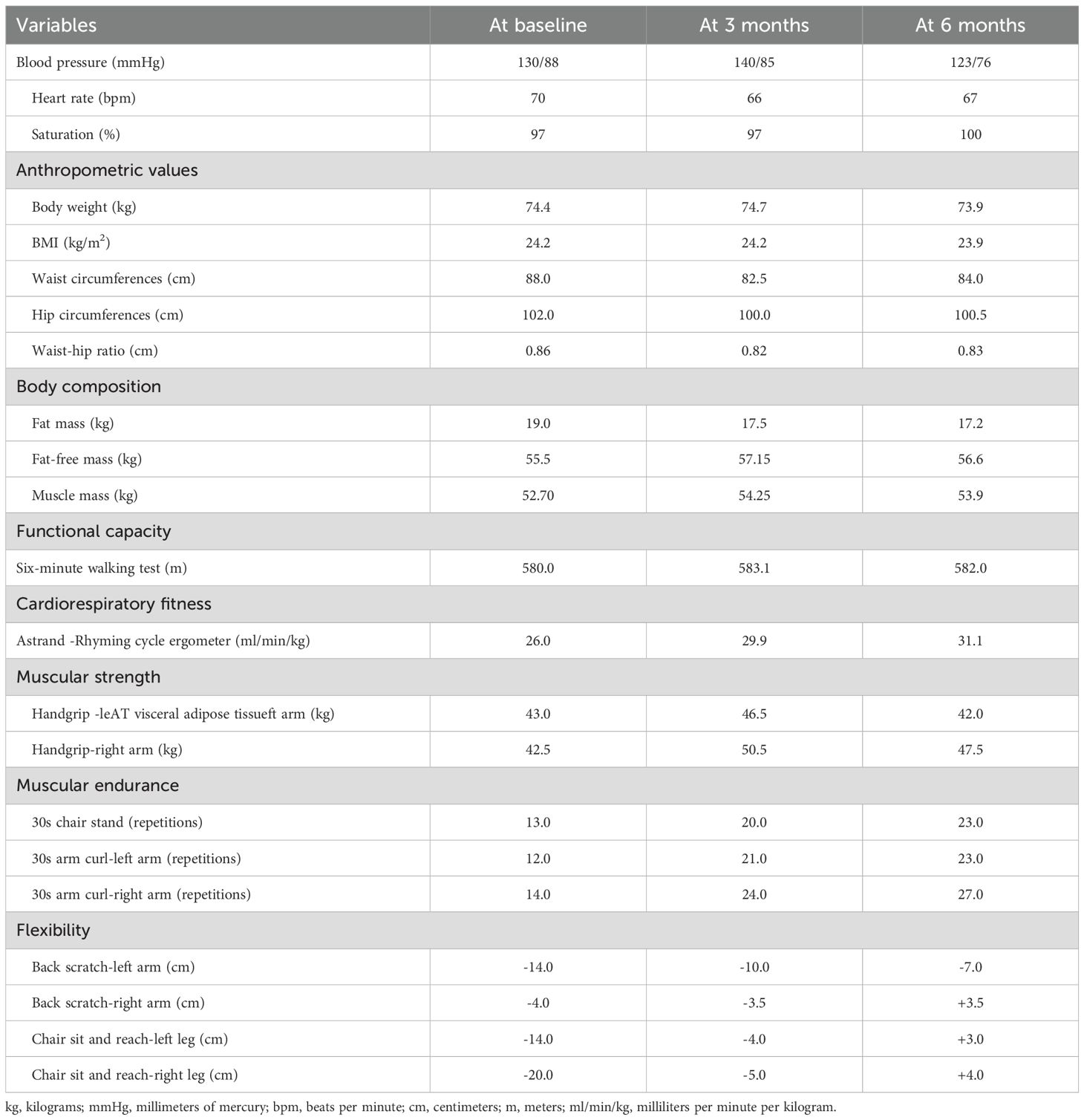 Over the 6 months, a combined aerobic and resistance training program was proposed, with the prescription organized into two macrocycles, each lasting 3 months (Figure 1). During the first three months, the primary focus was on increasing fat burn while maintaining or gaining muscle mass. In this sense, a moderated intensity continuous training was proposed. The duration of the aerobic part, performed on a treadmill or a cycloergometer, started with 15 minutes and progressively increased every two weeks until reaching 30 minutes per session. The intensity was set to a moderate level and checked using the rate of perceived exertion (RPE) - CR-10 Borg Scale, specifically at a 3–5 RPE. Resistance training included five bodyweight or elastic band exercises (e.g., squat, biceps curl, crunch, back extension, triceps extension, lunges), performed in 2–3 sets of 8–12 repetitions, which progressively increased over the weeks. Intensity was maintained at a moderate level, i.e., 3–5 RPE. A 5-minute warm-up (dynamic stretching) and cool-down (static stretching) preceded and concluded each session. Months 3–6 were dedicated to maintaining muscle mass and maximizing cardiorespiratory fitness. In this sense, the prescription of the aerobic component was reorganized into interval training, consisting of 3–4 rounds of 2–4 minutes at high intensity (5–7 RPE), interspersed with 1–3 minutes of light-intensity exercise (1–2 RPE). Progression in duration and number of rounds occurred over the week, based on the patient’s response. The resistance part was modified to incorporate progressive overload training, using isotonic machines or free weights, in 3–4 sets of 10–12 repetitions at a moderate to somewhat vigorous intensity, i.e., 3-6. The warm-up and cool-down remained equal.