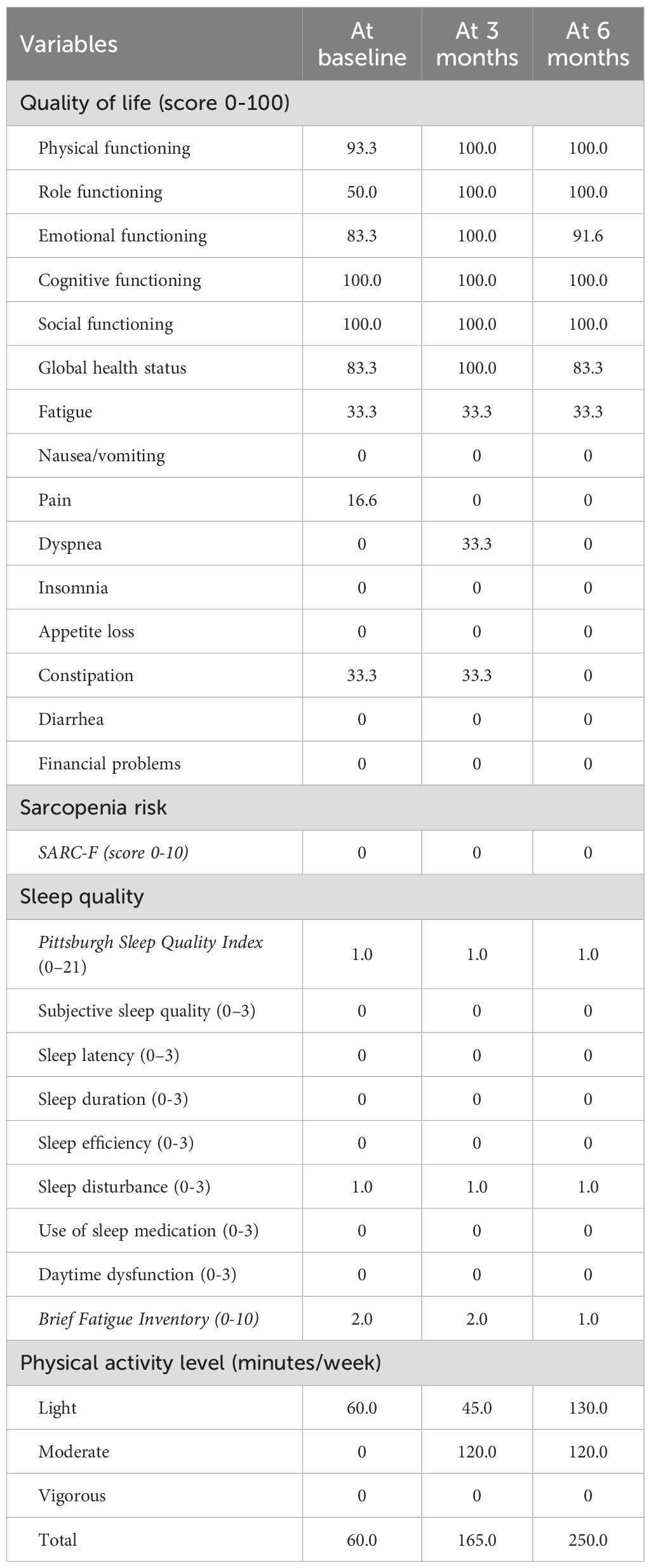Assessments were performed at baseline, after 3 and 6 months, by a researcher not involved in the delivery of the intervention. Before the physical fitness evaluations, blood pressure, heart rate, and oxygen saturation were recorded. The following physical fitness parameters were evaluated: i) functional capacity using the Six-Minute Walk Test, using the American Thoracic Society guidelines (14), ii) cardiorespiratory fitness, through the Astrand–Rhyming submaximal test (15), iii) muscle strength, using the handgrip strength test, iv) upper and lower limb muscular endurance, with the 30-second arm curl and the 30-Second Chair Stand Test (16, 17), v) anthropometric values, by body weight, height, and waist and hip circumferences (18), vi) body composition using the bioelectrical impedance scale (Tanita RD-545 HR), vii) static balance with the single leg stance test (19), viii) flexibility with the back scratch test and the chair sit-and-reach test (20). Patient-reported outcomes were collected using the following validated questionnaires: i) quality of life using the European Organisation for Research and Treatment of Cancer Quality of Life Questionnaire Core 30 (EORTC QLQ C-30) (21); ii) sarcopenia risk with the SARC-F (22); iii) fatigue level with the Brief Fatigue Inventory (23); iv) Godin’s Leisure Time Exercise Questionnaire to measure physical activity levels (24). Circulatory parameters were obtained from medical records. Additionally, routine staging CT images at the L3 vertebra level were used to quantify body composition changes since diagnosis and during the exercise program (December 2024, February 2025, May 2025).