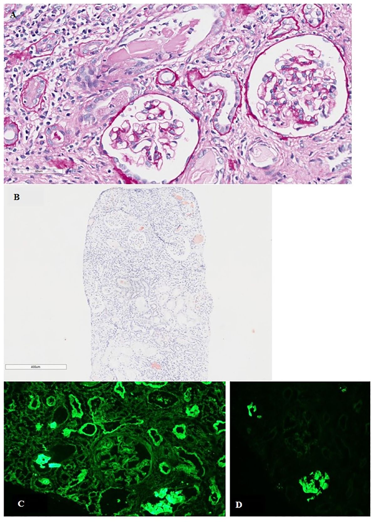 Figure 1. (A) Tubulo-interstitial nephritis with fractured intratubular cast surrounded by granulomatous inflammatory reaction. Mild mesangial matrix expansion in the glomeruli (PAS; original magnification, ×400). (B) Tubular casts positive for Congo red staining (original magnification, ×400). (C) Direct immunofluorescence for κ- and λ-LC showing κ-LC restriction along the glomerular basement membranes and tubular basement membranes (original magnification, ×200). (D) Polyclonal reaction in tubular casts (original magnification, ×200). PAS, periodic acid–Schiff stain; LC, light chain.