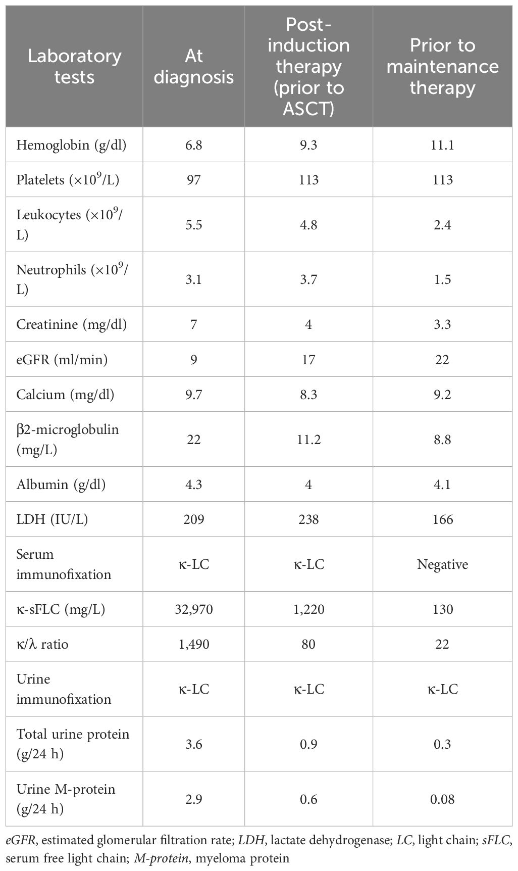 Table 1. Main laboratory findings at diagnosis, before autologous stem cell transplant (ASCT), and before maintenance.