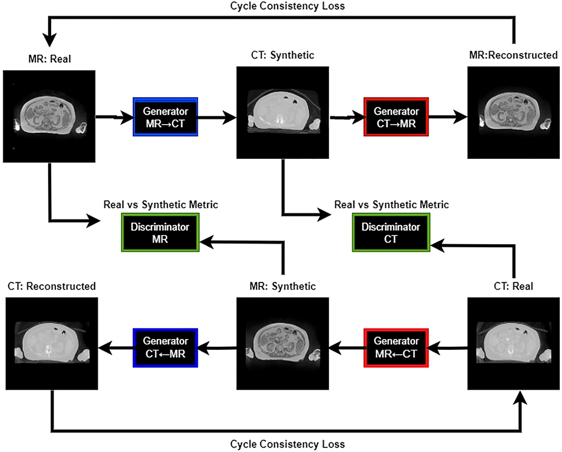Our study utilized the CycleGAN (Cycle-Consistent Generative Adversarial Network) model architecture (24). Training workflow of the CycleGAN model has been shown in Figure 2. Figure 3 details the architecture of CycleGAN. This architecture is a derivative of the generative adversarial network (GAN) (25), a popular deep-learning architecture which leverages two competing networks: a generator and a discriminator. In GANs, a generator generates a synthetic image from an input image, and the discriminator predicts whether this synthetic image is real of fake. The model stops learning when the generator produces indistinguishable images from the ground truth.