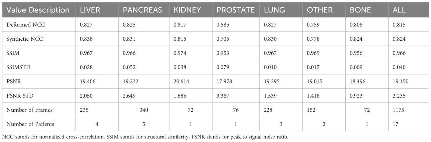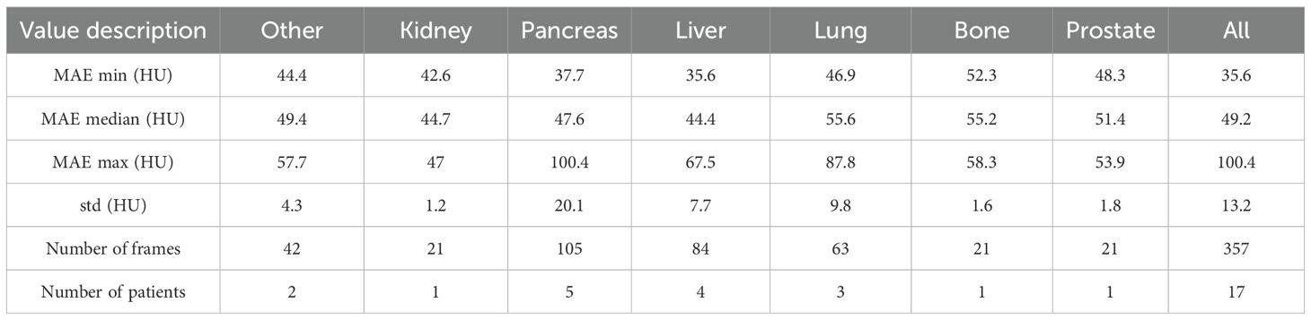 Table 1 reports the mean absolute error (MAE) of our cycle-GAN model. In total, 357 synthetic CT frames were analyzed from 17 patients. Of the treatment sites analyzed, the most common sites were liver, pancreas, and lung, with 84, 105, and 63 frames respectively. MAE was calculated by comparing synthetic CTs versus deformed CTs. Median MAE values across sites ranged between 44.7.4 HU to 55.6 HU with an overall median MAE of 49.2 HU. Pancreas and lung scans had the highest MAE standard deviations with 20.1 and 9.8 HU respectively. Kidney showed the least difference in MAE between scans with a standard deviation of 1.2 HU.
