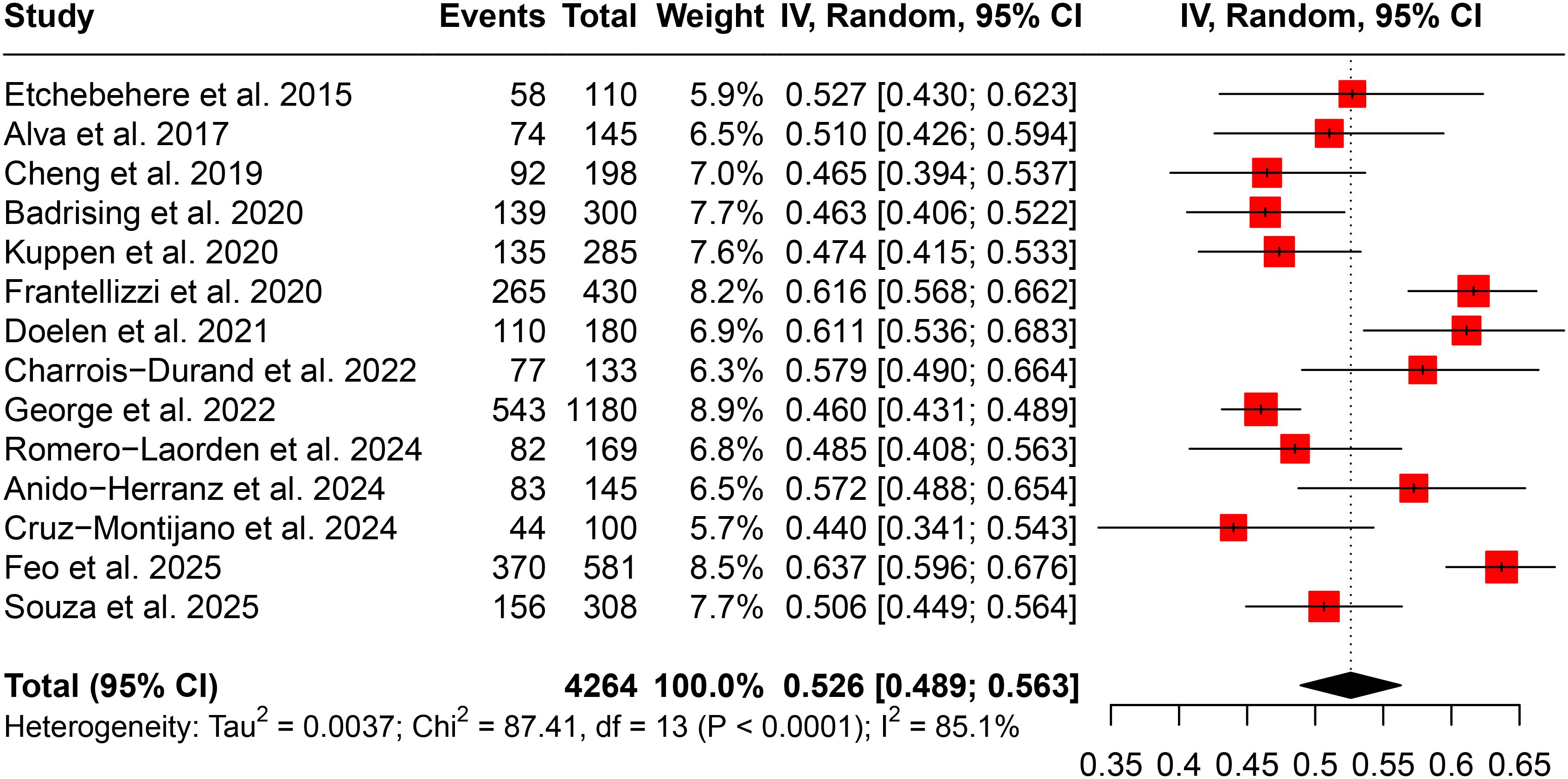 Completion of Ra-223 treatment was defined as receiving all six planned injections. As shown in Figure 2, the pooled completion rate across all included studies was 52.6% (95% CI: 48.9%–56.3%). However, there was significant heterogeneity among studies (I² = 85.1%), indicating substantial variability in completion rates across different cohorts.