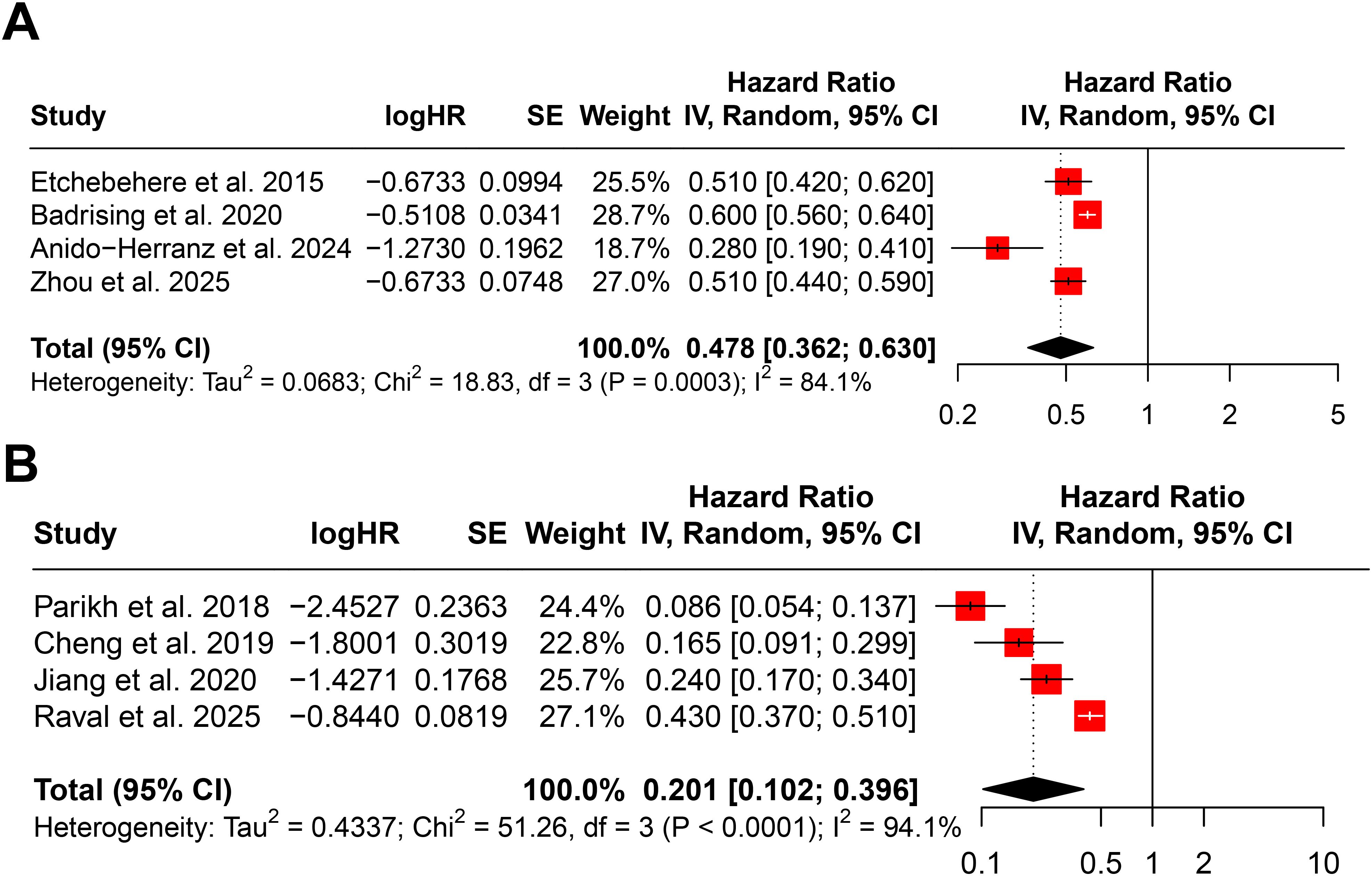 Higher numbers of Ra-223 injections were significantly associated with improved OS. When analyzed as a continuous variable, each additional injection was associated with a 52.2% reduction in the risk of death (HR = 0.478, 95% CI: 0.362–0.630; P < 0.001; I² = 84.1%) (Figure 3A). As a binary variable (more vs. fewer injections), the HR was 0.201 (95% CI: 0.102–0.396; P < 0.001; I² = 94.1%) (Figure 3).