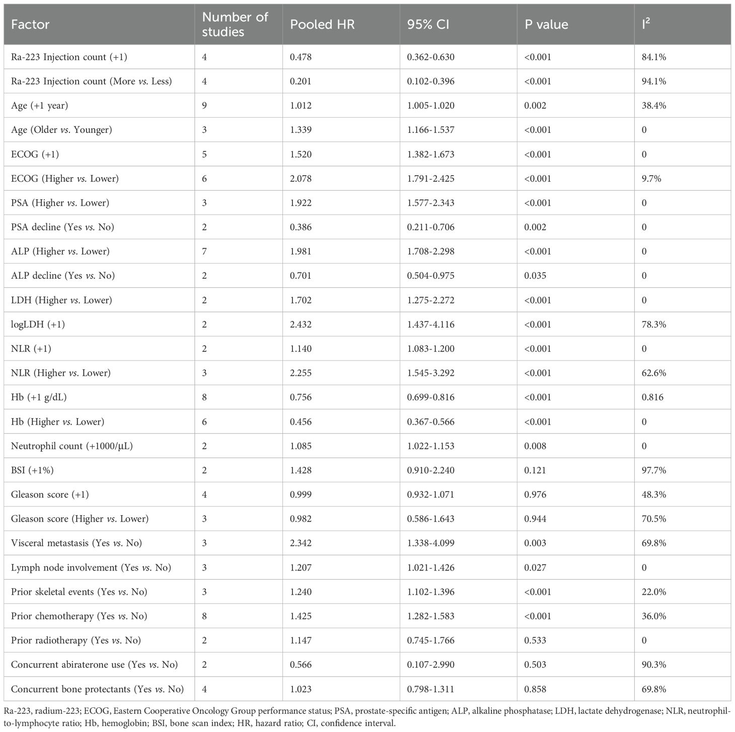 The impact of various clinical and laboratory factors on OS following Ra-223 treatment was evaluated based on HRs extracted from the included studies. A total of 27 potential prognostic indicators were analyzed. The pooled results are summarized in Table 2, and representative forest plots are presented in Figure 3 and Supplementary Figures S2-S7.