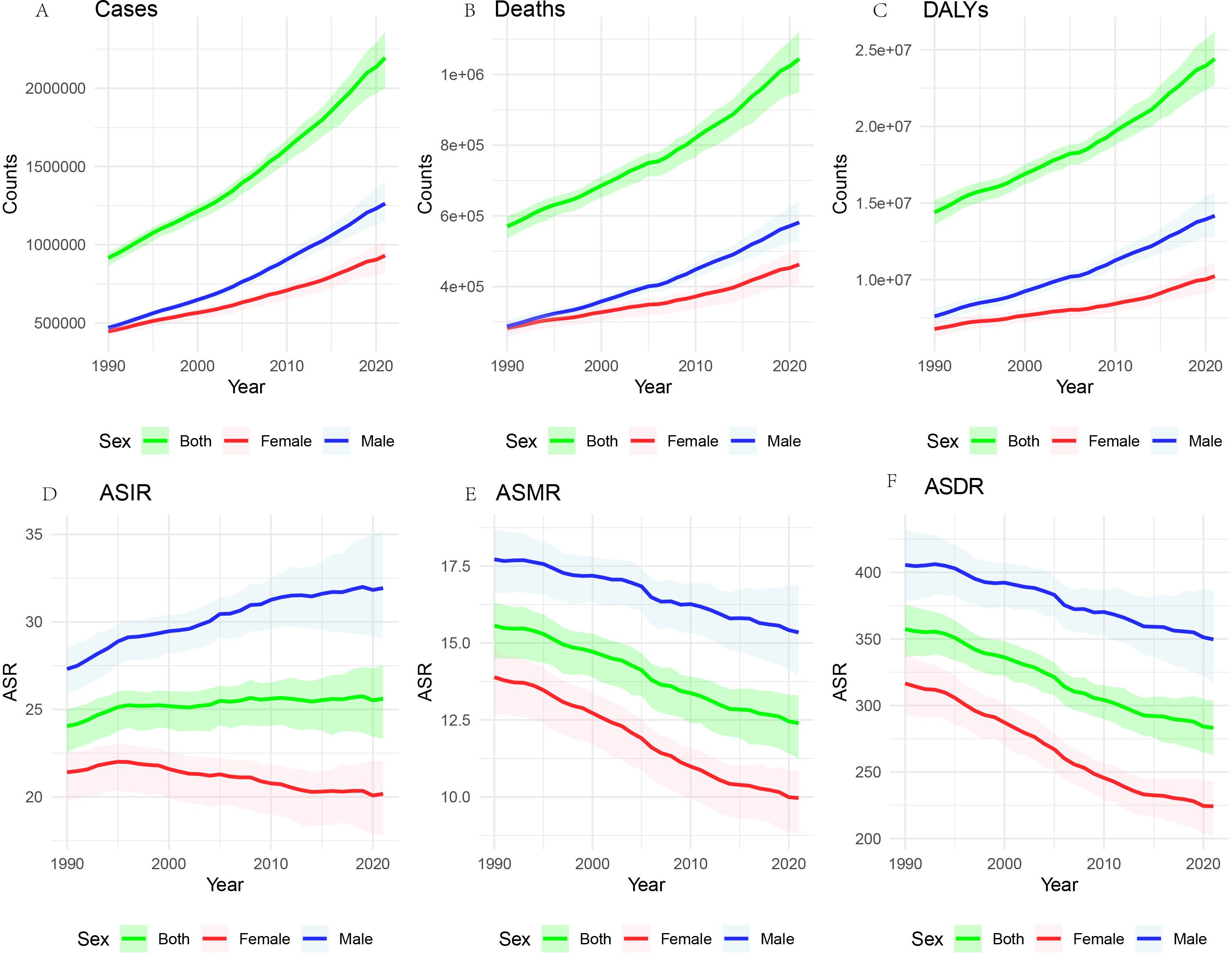 Figure 1. Global burden of CRC, 1990-2021. The number of cases (A), the number of deaths (B) the total number of DALYs (C). ASIR (D), the age-standardized incidence rate; ASMR (E), the age-standardized mortality rate; and ASDR (F), the age-standardized disability-adjusted life years rate.