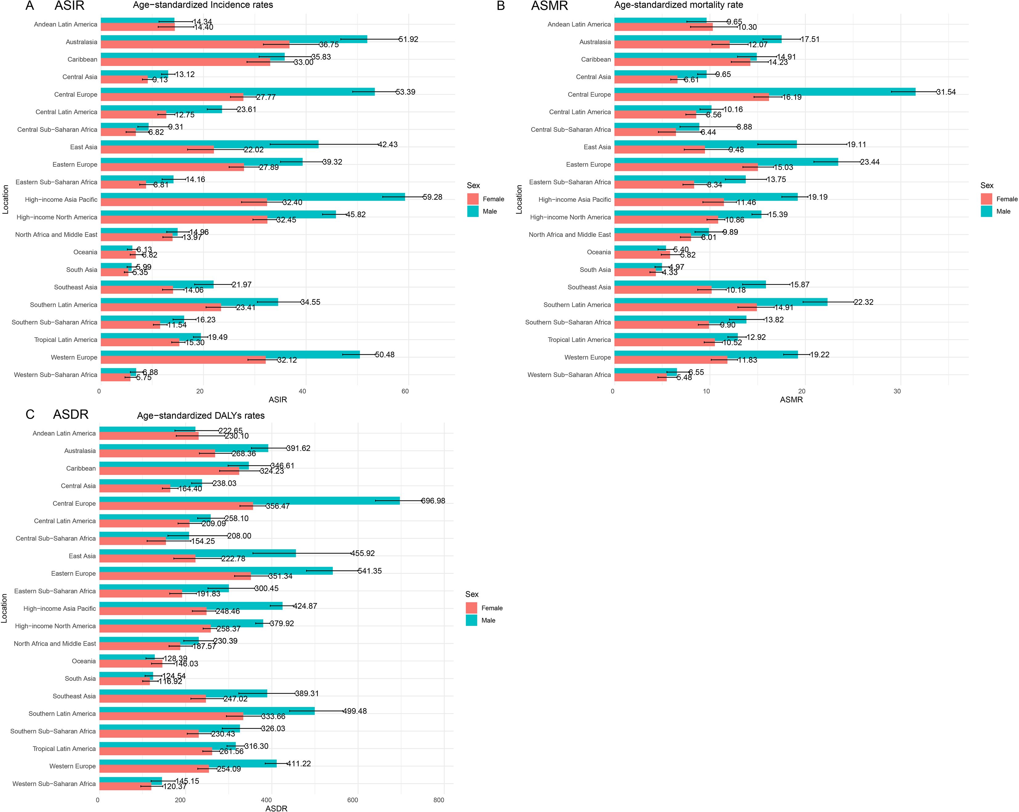 In 2021, the impact of CRC was evaluated across 21 GBD regions (Figure 2). Notable regional variations were observed. The ASIR was highest in the high-income Asia Pacific region at 44.89 per 100,000 population (95% UI: 40.2, 47.85) and lowest in South Asia at 5.65 per 100,000 population (95% UI: 5.08, 6.3). The ASMR peaked in Central Europe at 22.58 per 100,000 population (95% UI: 20.81, 24.28) and was lowest in South Asia at 4.63 per 100,000 population (95% UI: 4.17, 5.16). The ASDR showed a similar pattern, with Central Europe at 506.48 per 100,000 population (95% UI: 467.97, 544.57) and South Asia at 120.37 per 100,000 population (95% UI: 108.3, 135.3). Importantly, the burden of CRC was greater in males, especially in Central Europe, where males were nearly twice as likely to develop CRC compared to females, with an ASIR of 53.39 per 100,000 population for males versus 27.77 per 100,000 population for females.