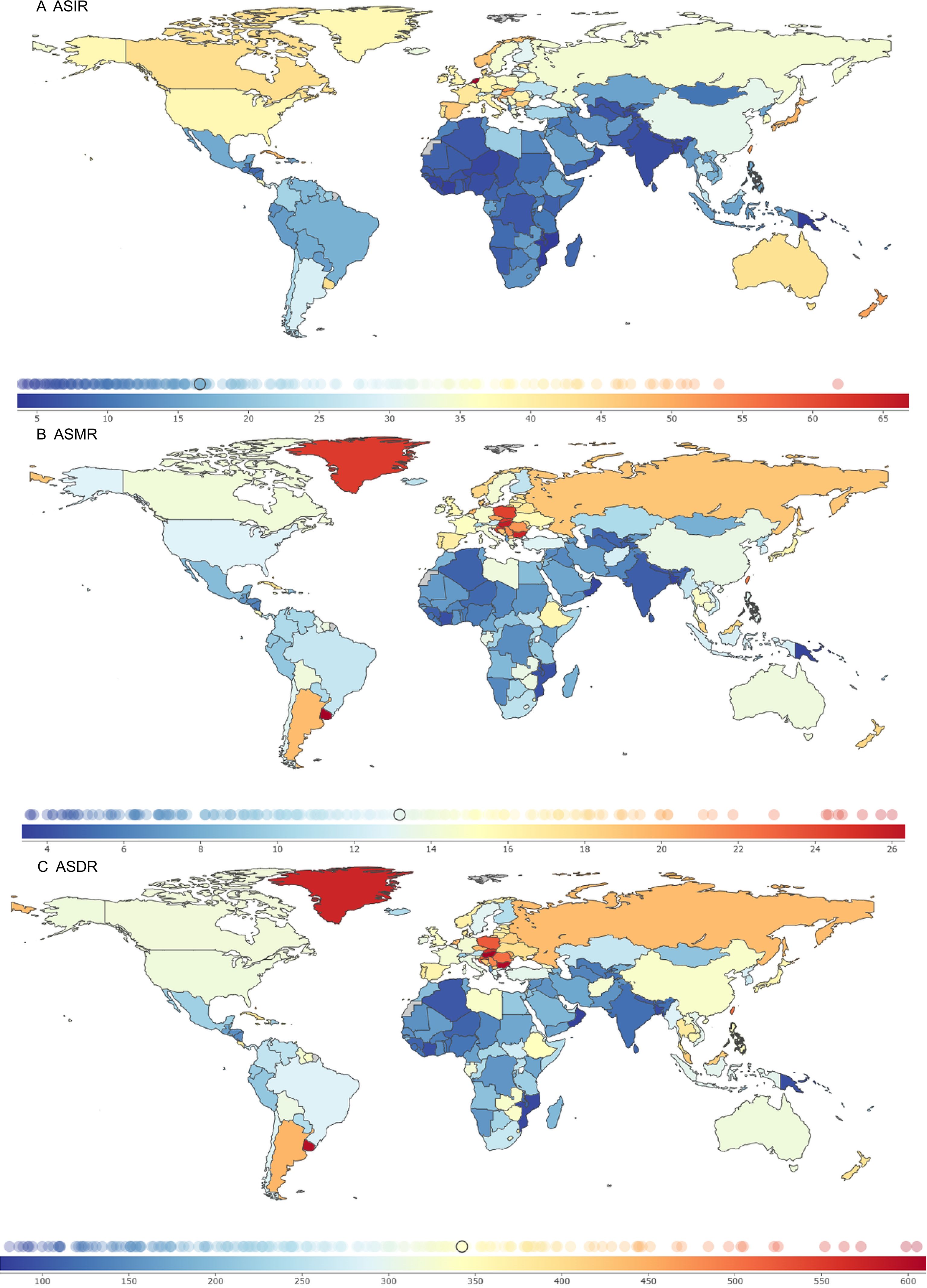 The Eastern Republic of Uruguay, Hungary, and the Republic of Bulgaria had the highest ASMR burdens, at 27.46 (95% UI: 24.25, 30.91), 26.01 (95% UI: 21.73, 31.13), and 25.71 (95% UI: 20.96, 30.73) per 100,000 population, with EAPCs of 0.03 (95% CI: -0.06 to 0.13), -0.63 (95% CI: -0.86 to -0.40), and 1.05 (95% CI: 0.86 to 1.24), respectively.